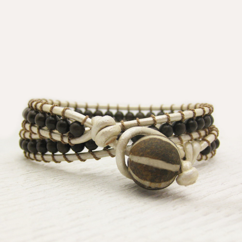 Pyrite Leather Wrap Bracelet with Coconut Wood and 100% Silk