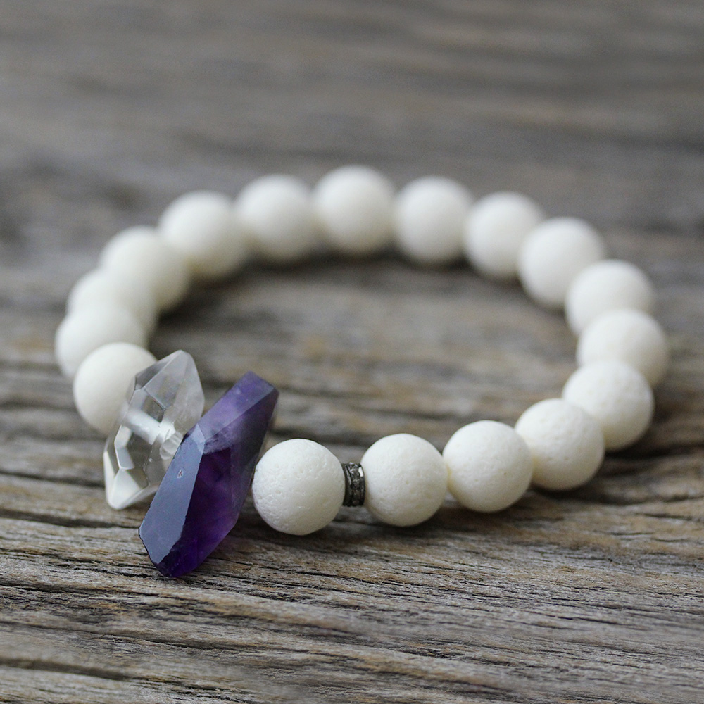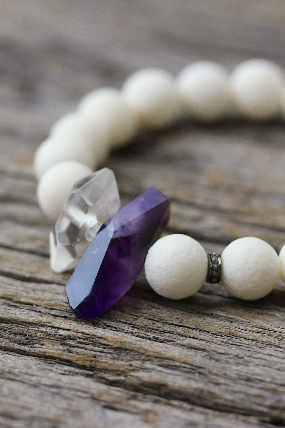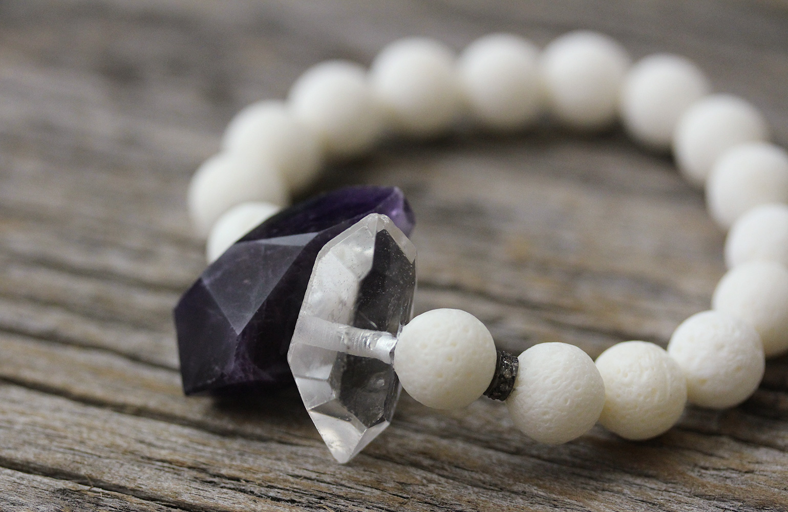 Gorgeous large amethyst nuggets are paired with double terminated quartz, coral and beautiful diamonds in oxidized sterling silver. This is the perfect statement bracelet that can be worn alone or paired with others. The beautiful color variations in the amethyst will hold your gaze. It is sure to become a new favorite.