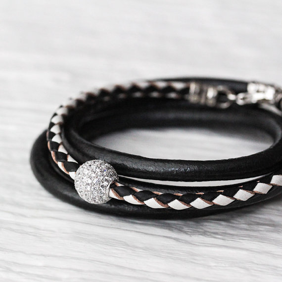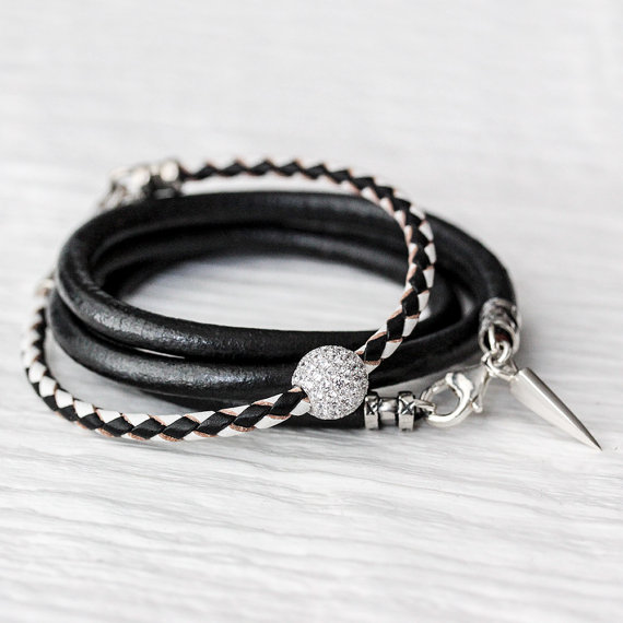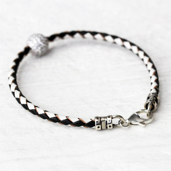 **This listing is for the Black and White Leather Bangle Bracelet with Sterling Pave only.