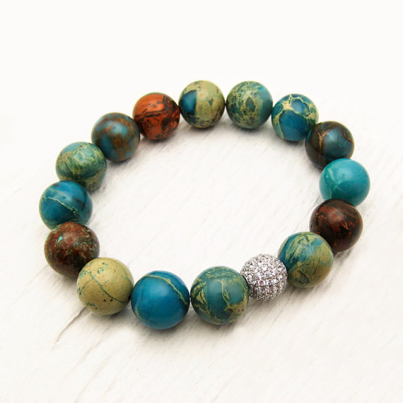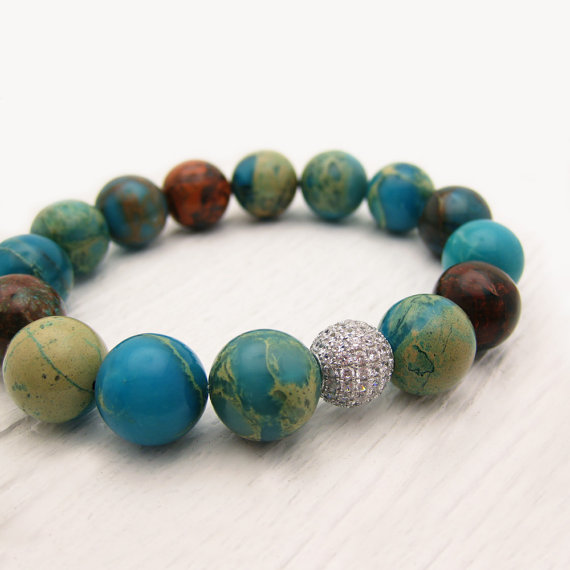 Gorgeous snakeskin jasper is FULL of amazing color tones. There is Caribbean blue, beige, tan, mahogany and more earth tones that swirl through each stone. I have complimented this bracelet with an incredible Sterling Silver CZ Pave bead with rhodium plating. The rhodium prevents tarnishing and will not chip off. The cubic zirconia shines and sparkles like diamonds.