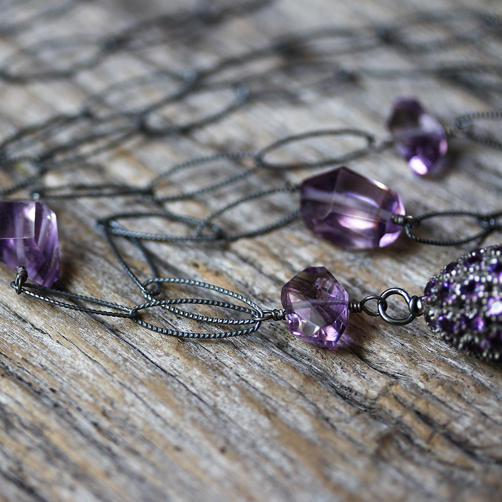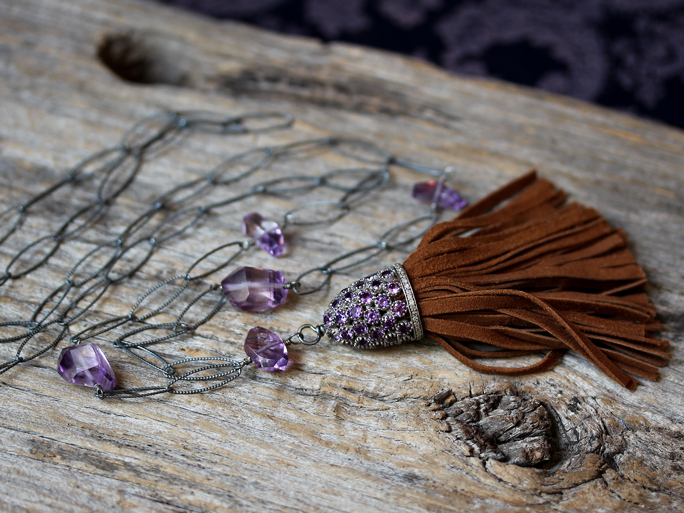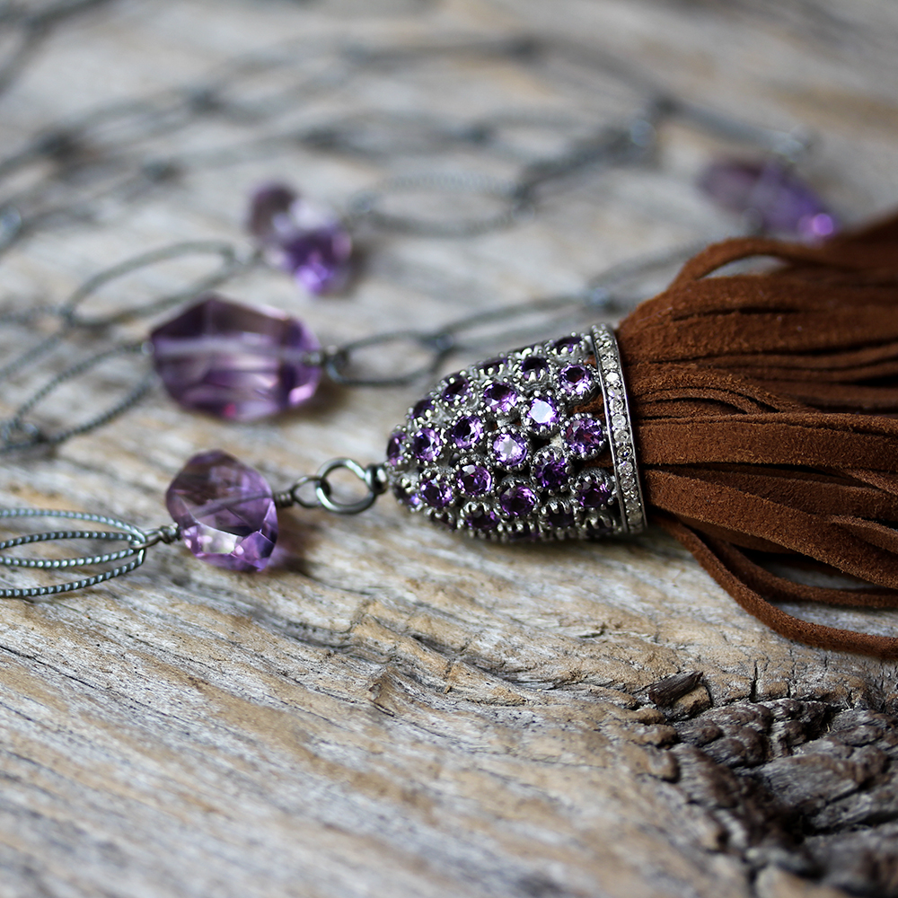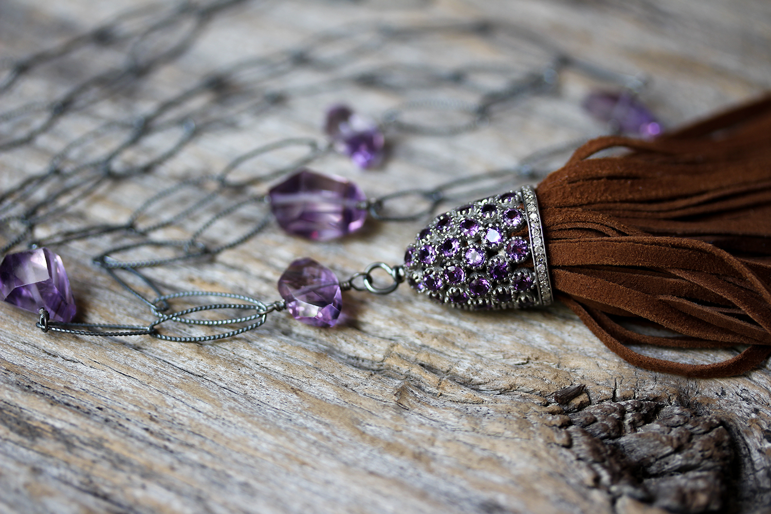 Breathtaking Amethyst and Diamond Pave encases an eco-friendly suede tassel in this boho, yet elegant long necklace. The hand oxidized and polished sterling silver chain is embellished with gorgeous faceted Brazilian amethyst and is the perfect length to make a statement. This necklace works effortlessly from day to night.