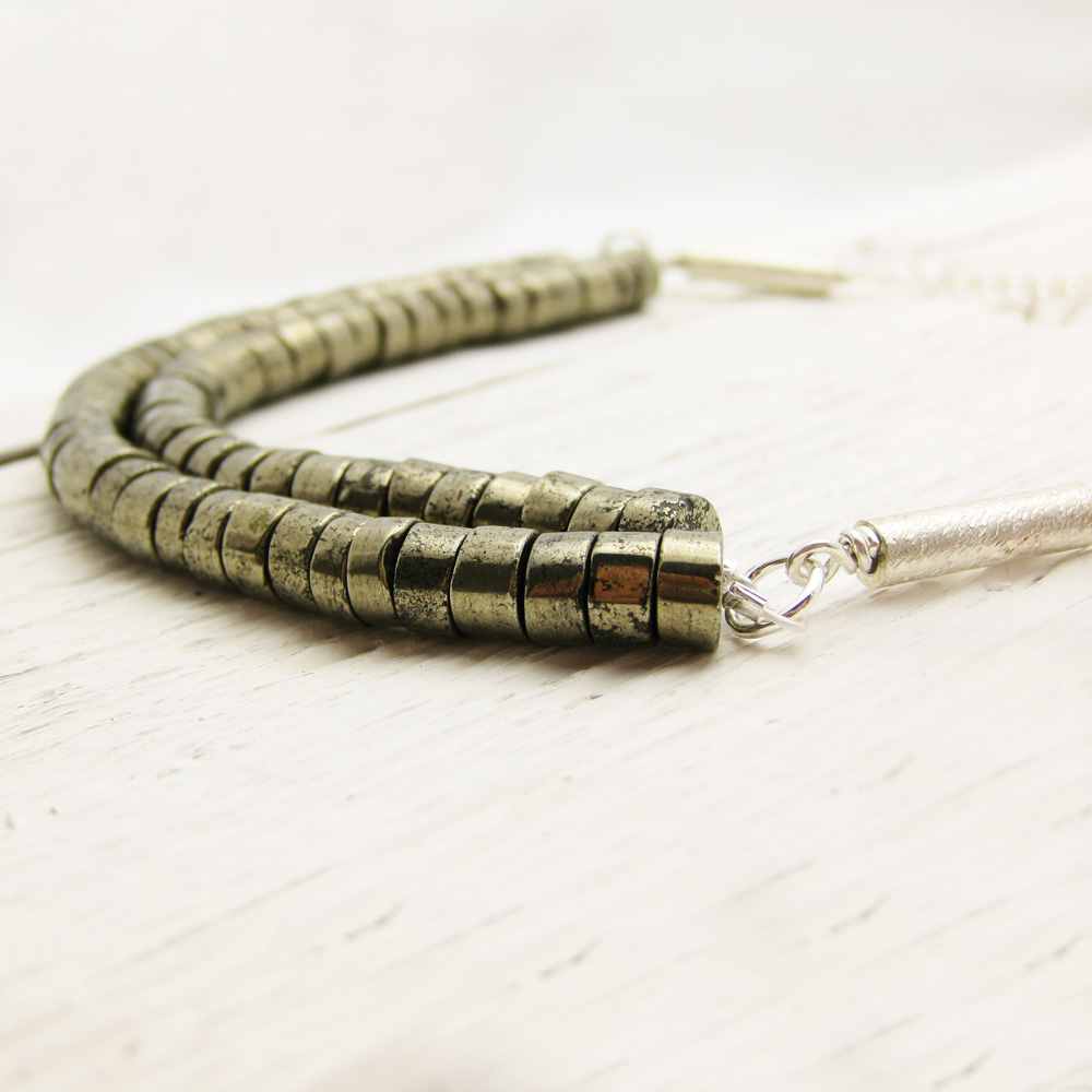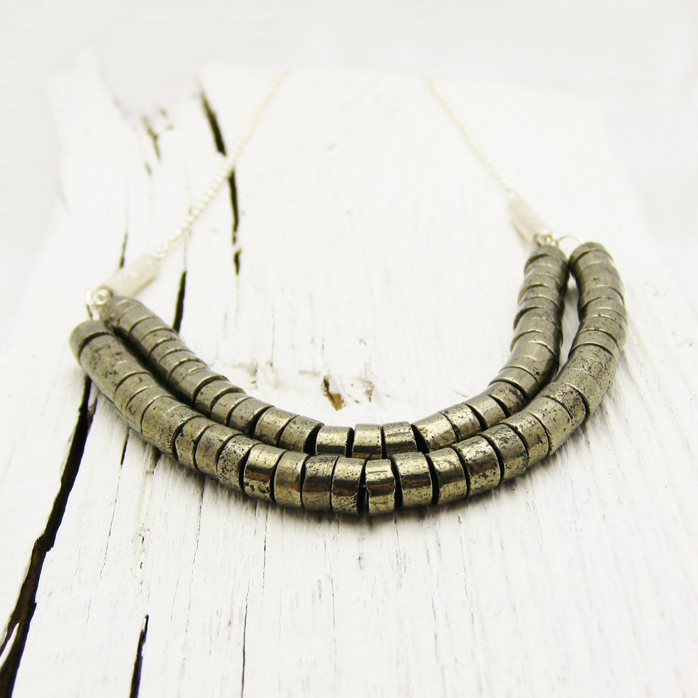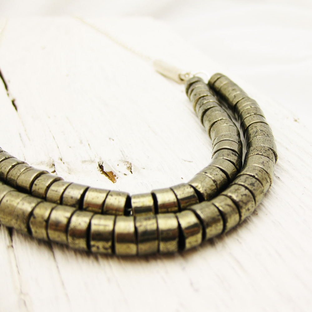This lush Brazilian Heishi Pyrite necklace is bold and substantial. The untreated pyrite is naturally gorgeous and organic. The pyrite is strung on nylon coated sterling silver wire for strength. Two brushed sterling silver tubes are attached to the strands in *Argentium silver and hang from a gorgeous sterling silver chain.