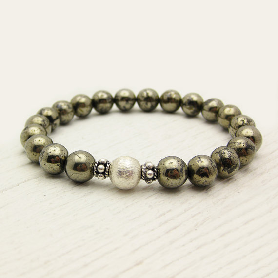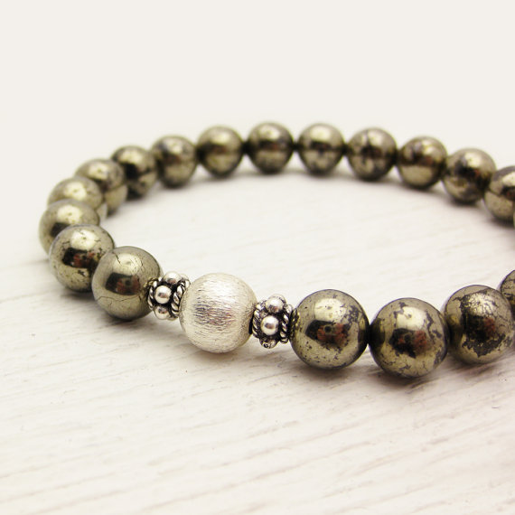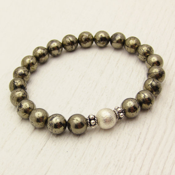 Gorgeous smooth Brazilian Pyrite is finished with Bali sterling silver and a brushed sterling silver focal bead in this perfect versatile addition to your stacking beaded bracelets. This color tone is an incredible accent bracelet for mixing and matching with others! The golden metallic color of the pyrite makes other bracelets “pop” as well as making the perfect gold/silver combination.
