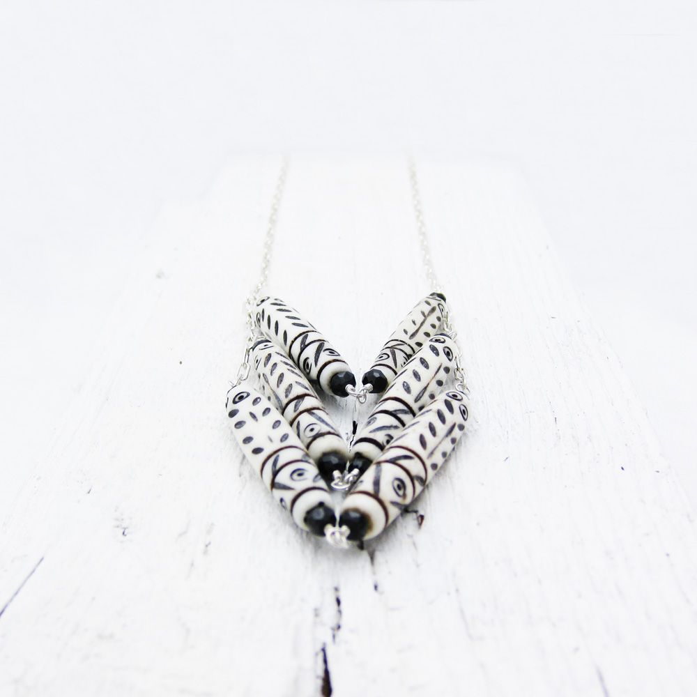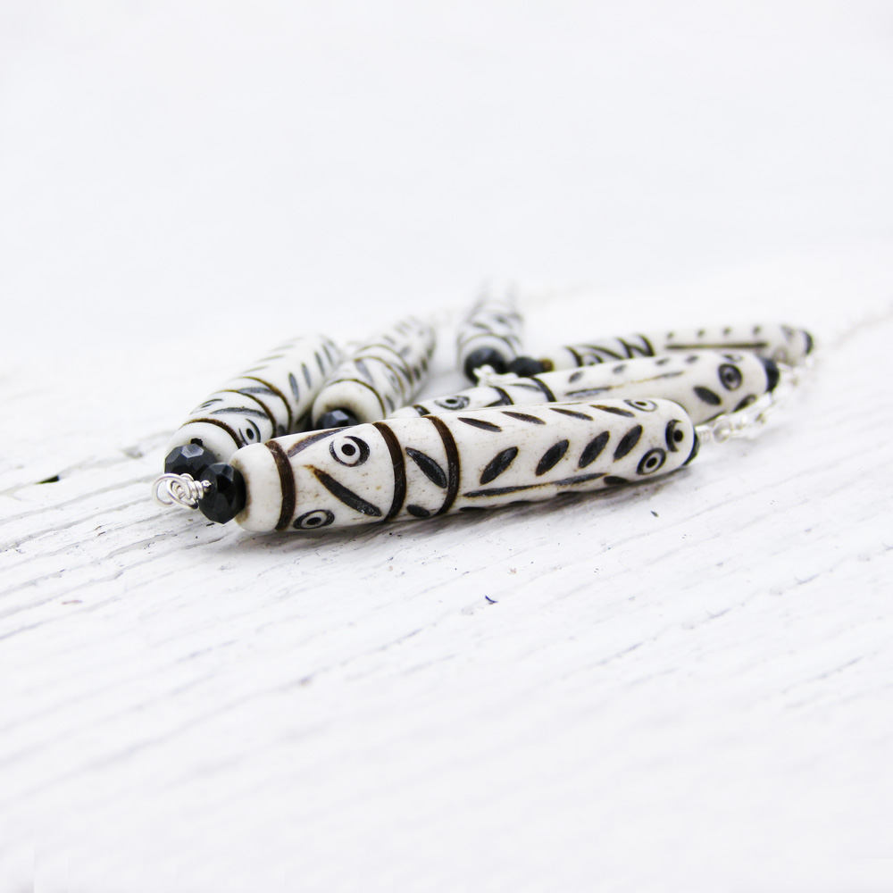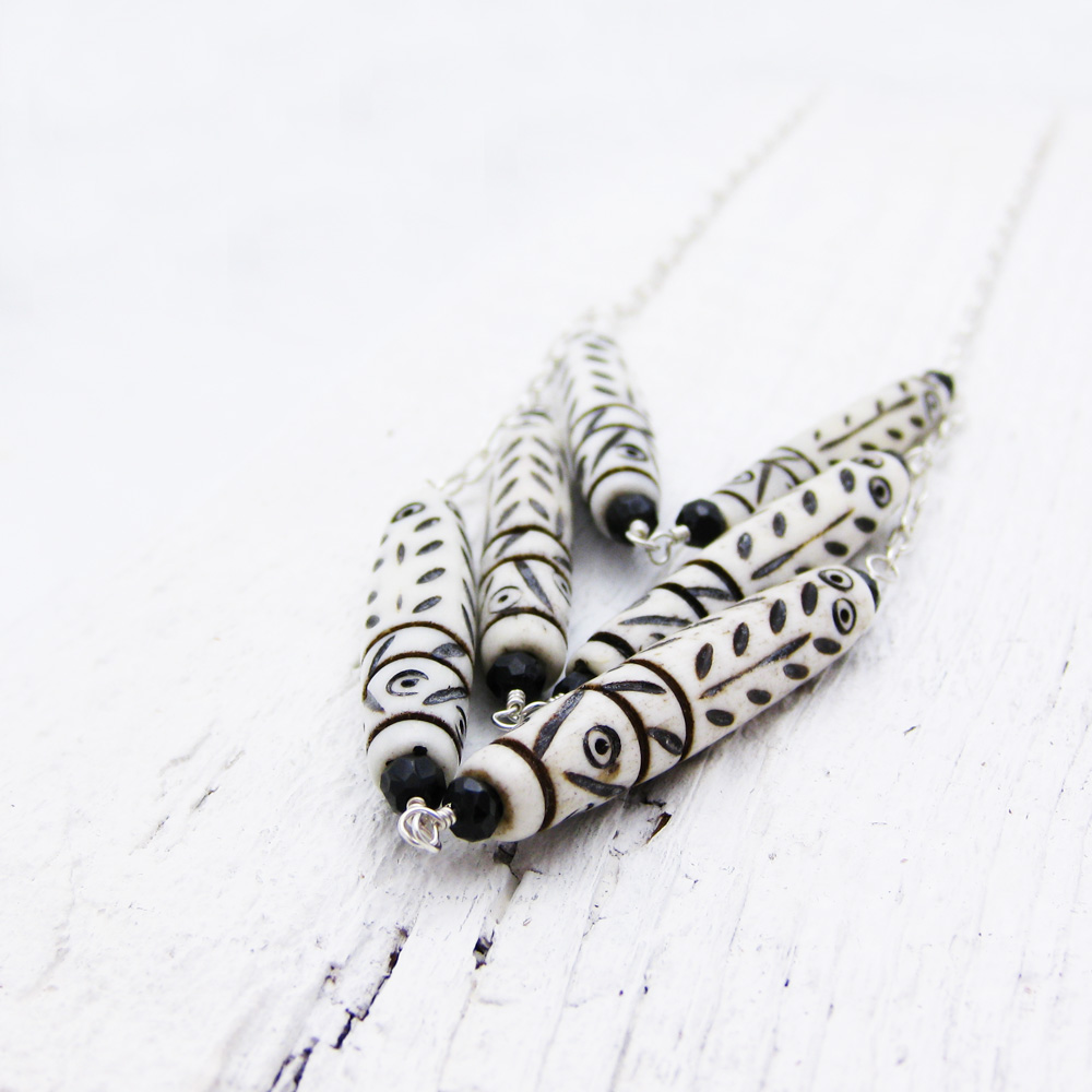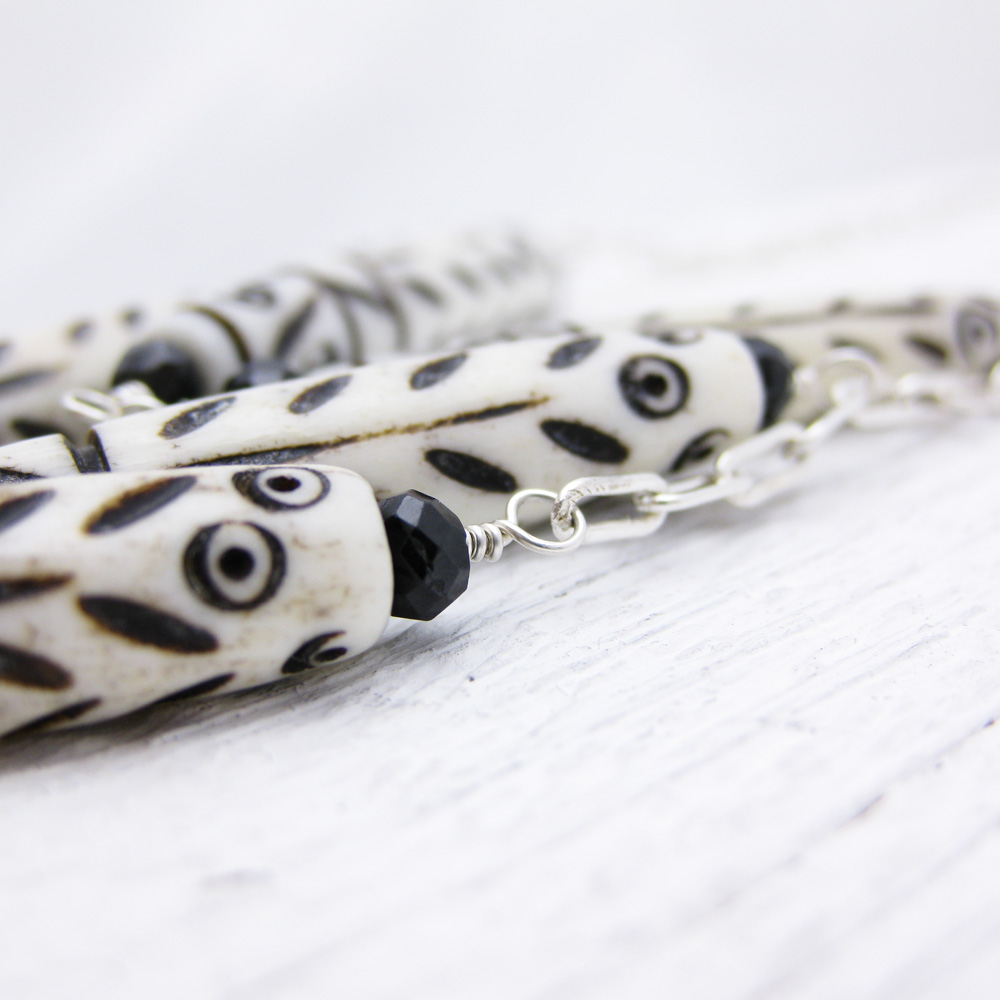This is the perfect boho statement necklace. It is made of the finest quality carved bone and beautiful faceted spinel. They are hand wrapped in *Argentium silver and hang delicately on gorgeous Italian sterling silver rectangular link chain.
