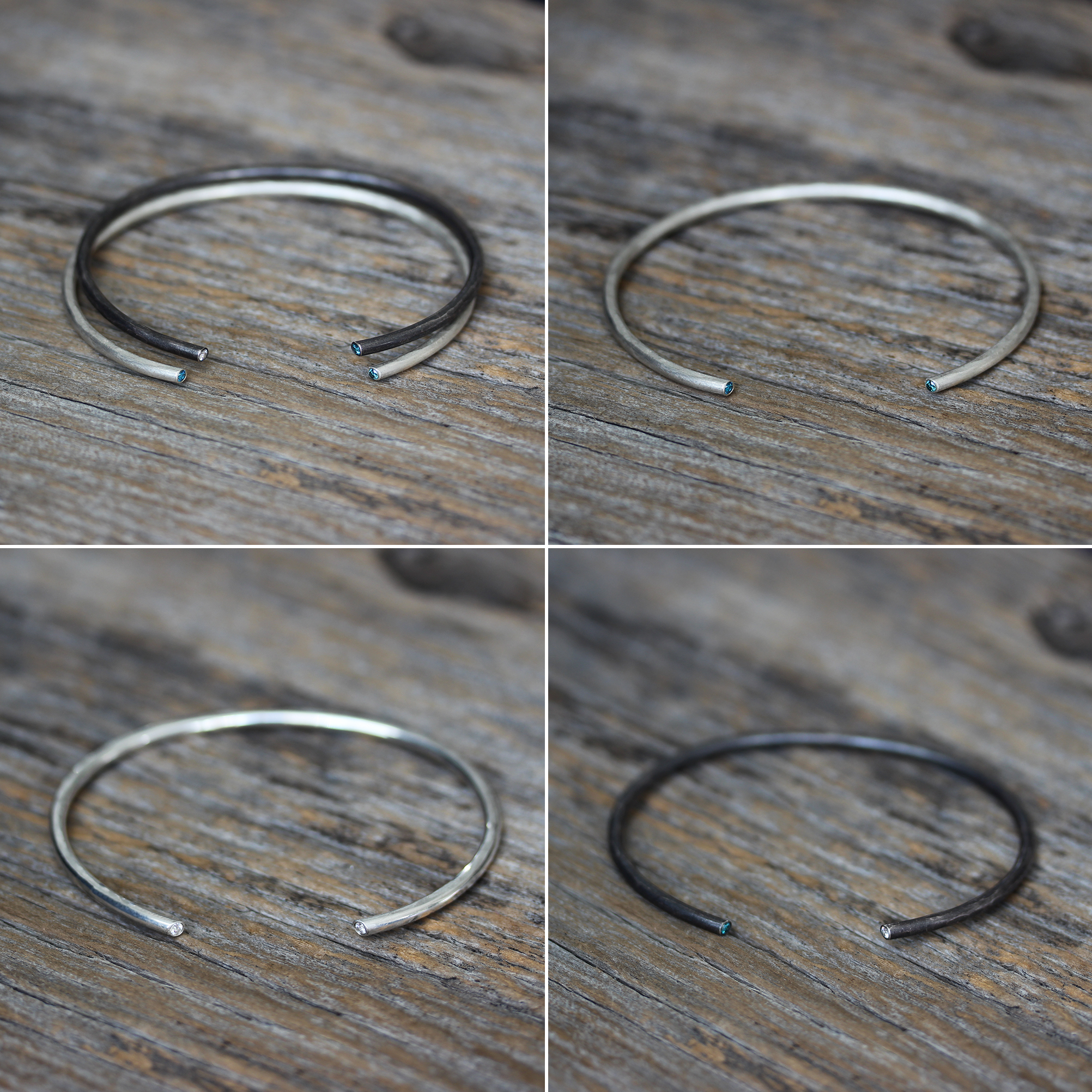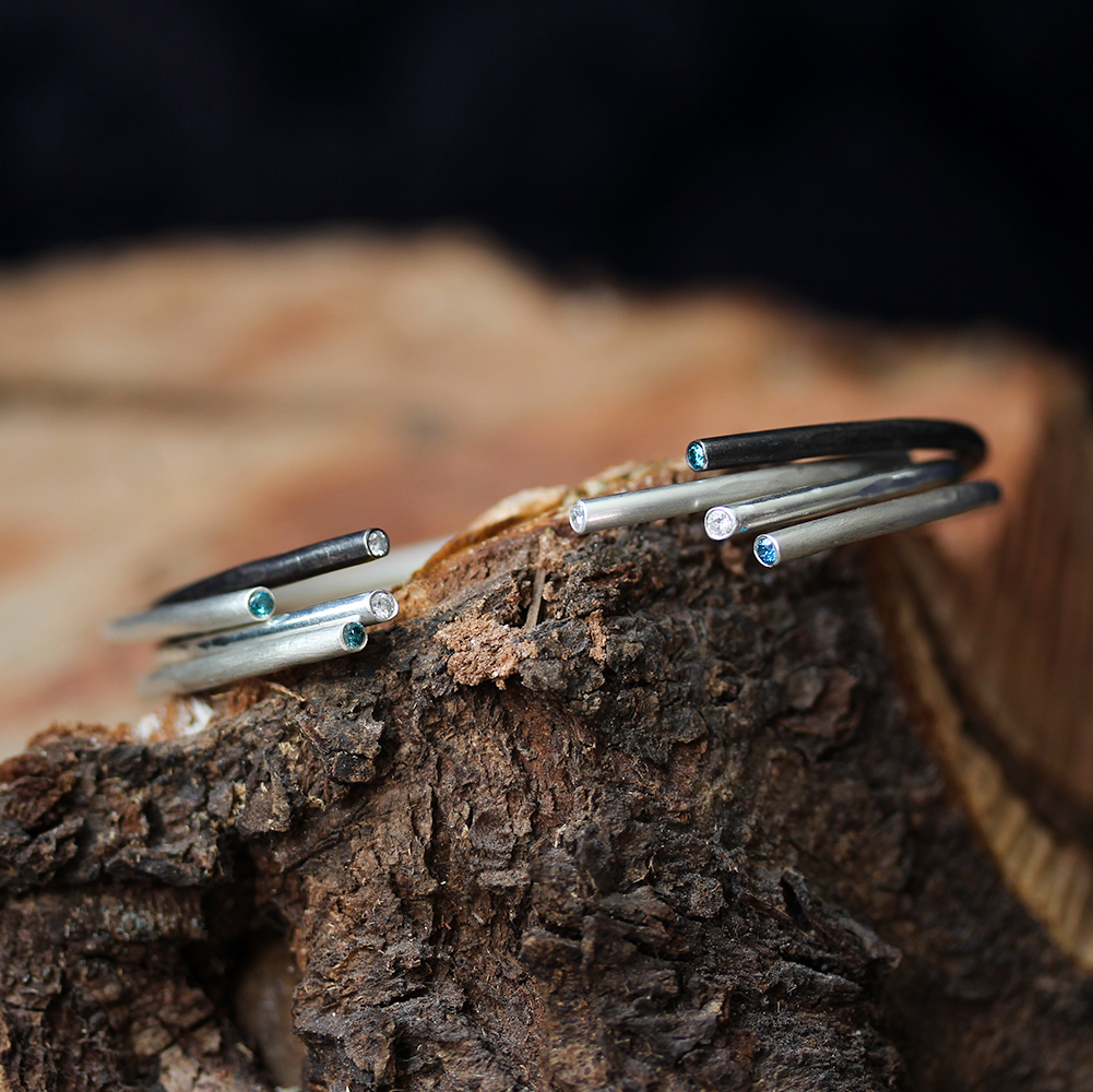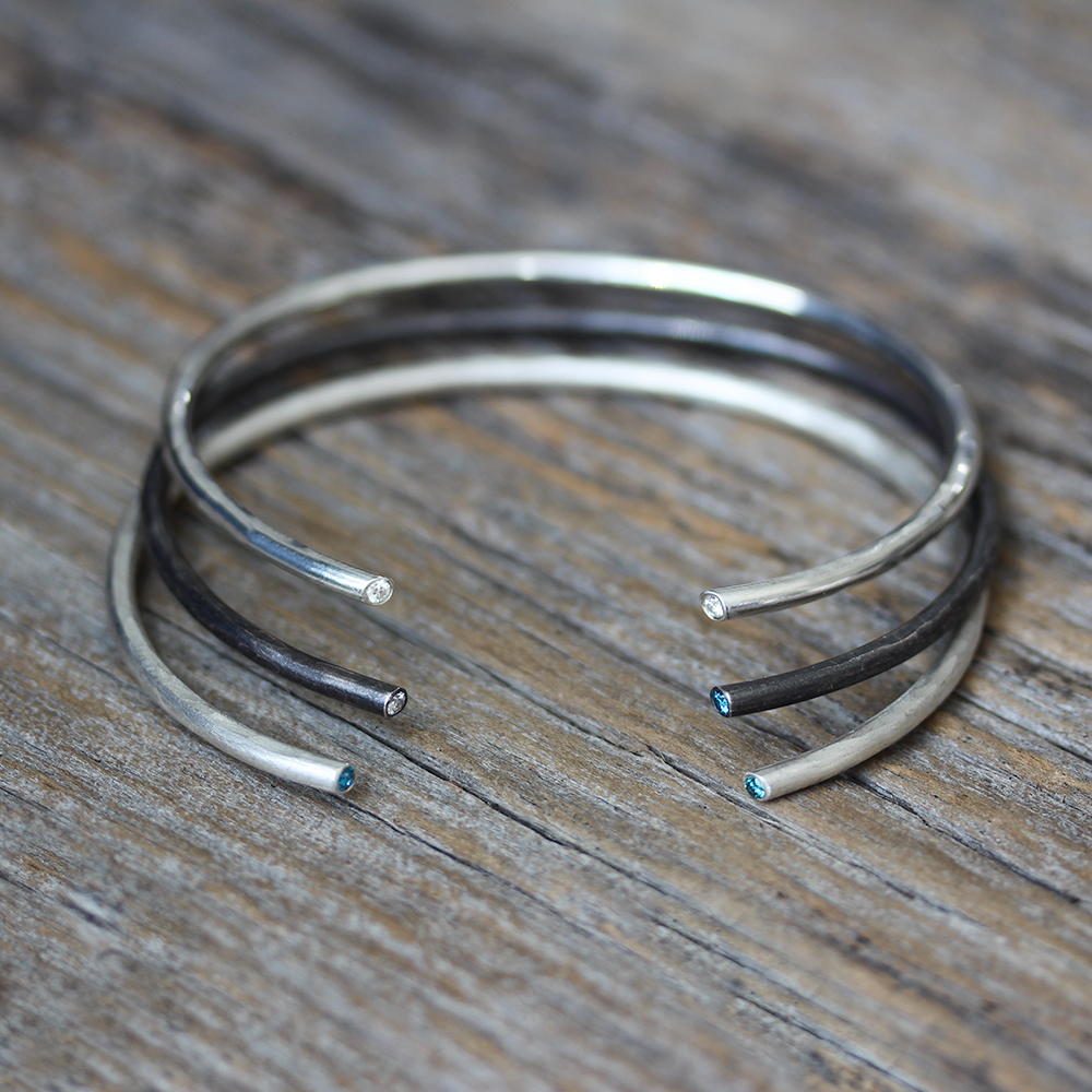 Gorgeous VSI G-H white diamonds and irradiated blue diamonds are set into the ends of these solid hand formed and hammered sterling silver bangle bracelets. They come in brushed, brushed and oxidized and shiny silver and with either two blue diamonds, two white diamonds or one of each. The diamonds are set at an angle so that they sparkle visibly on the wrist. They look absolutely amazing when stacked but also simply elegant when worn alone. They also pair beautifully with beaded bracelets. You will fall in love!