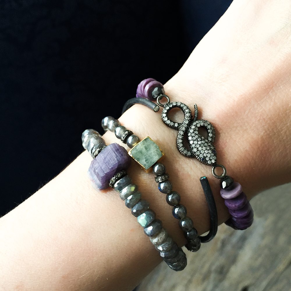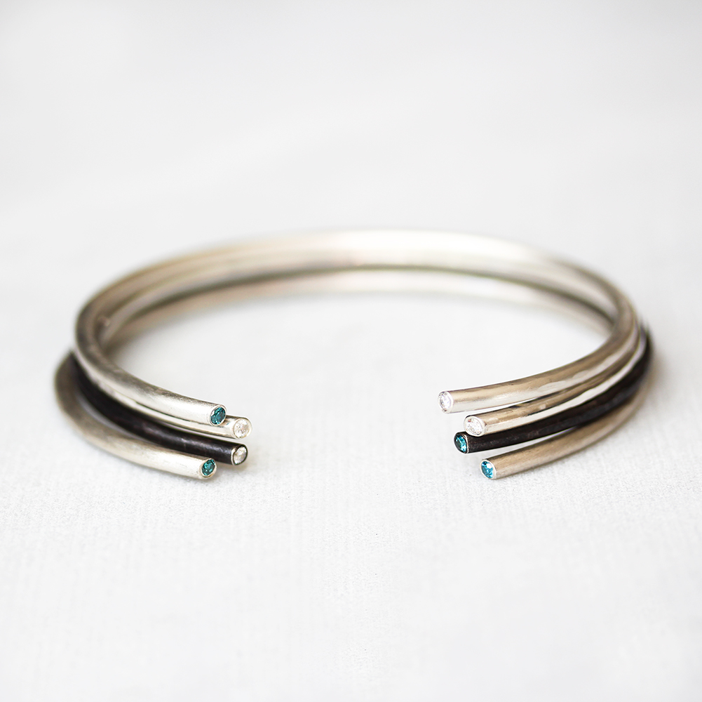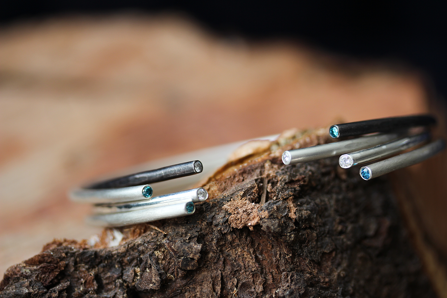 Gorgeous VSI G-H white diamonds and irradiated blue diamonds are set into the ends of these solid hand formed and hammered sterling silver bangle bracelets. They come in brushed, brushed and oxidized and shiny silver and with either two blue diamonds, two white diamonds or one of each. The diamonds are set at an angle so that they sparkle visibly on the wrist. They look absolutely amazing when stacked but also simply elegant when worn alone. They also pair beautifully with beaded bracelets. You will fall in love!