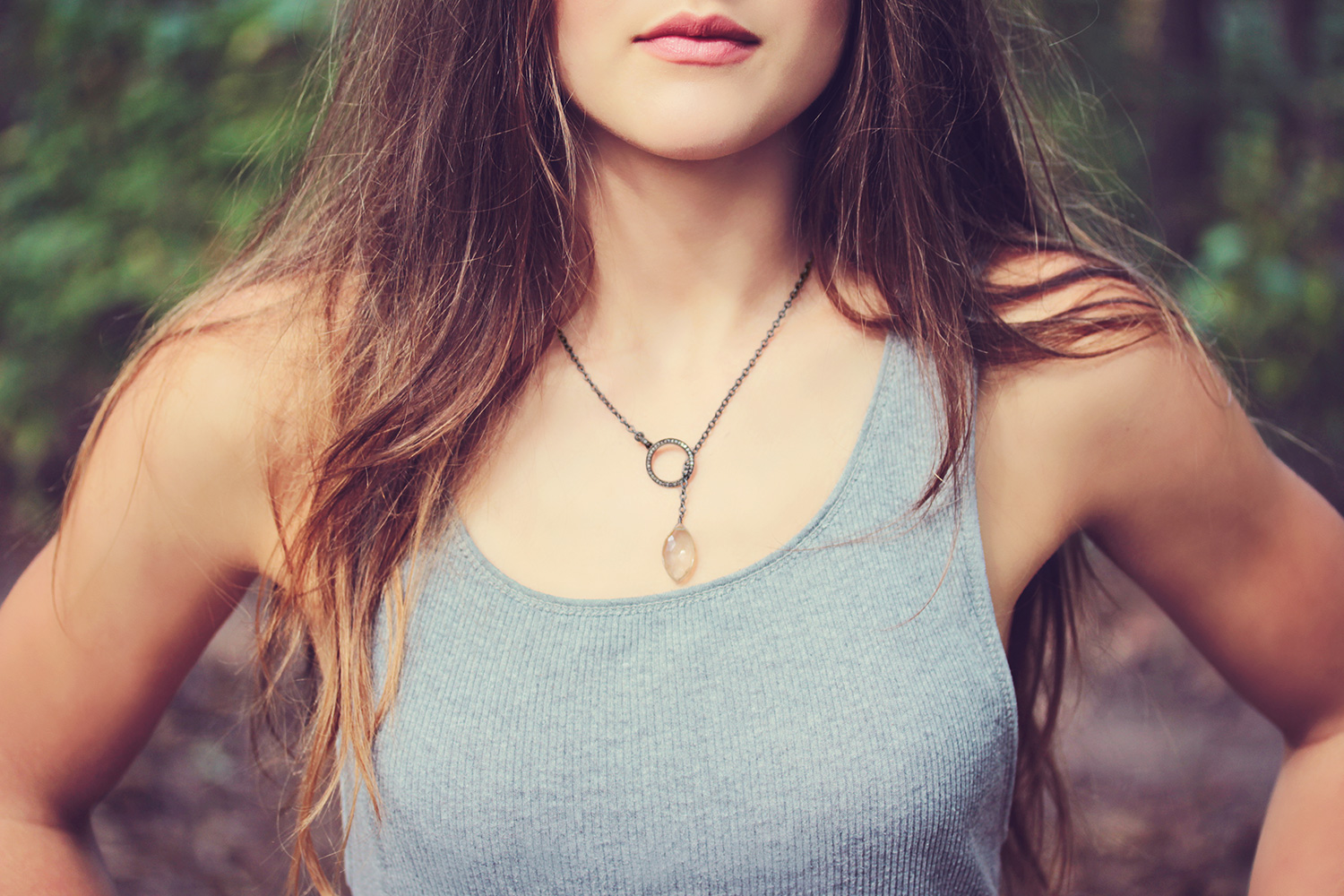 A single gorgeous, flawless faceted citrine marquis hangs delicately on diamond oxidized chain and slips through a simply stunning diamond pave hoop in this perfect every day necklace. The chain is hand oxidized sterling silver that is polished to a lovely metallic grey sheen. It works effortlessly day to night and is sure to be a new favorite.