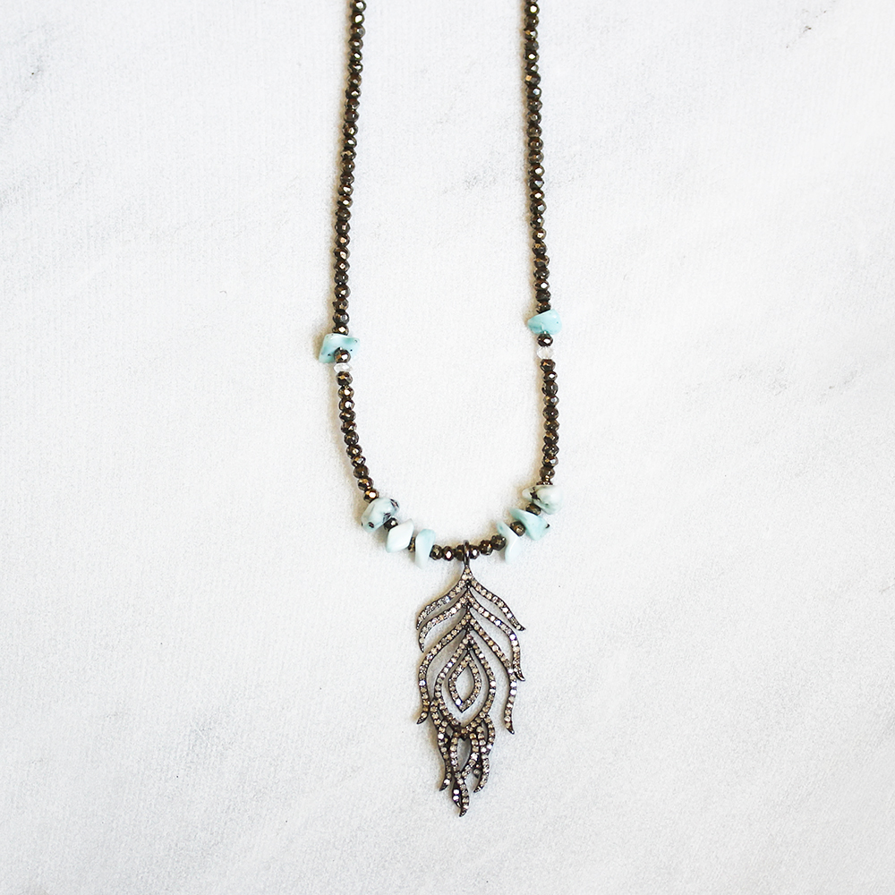 Gorgeous aquamarine, pyrite, labradorite and larimar drips down the length of this necklace toward an absolutely stunning diamond pave feather. The plumes individually move and dance creating a mesmerizing sparkle when worn. It is finished with an exquisite diamond pave clasp, adding a little extra bling to the back of the neck, so that it looks gorgeous with short or long hair.