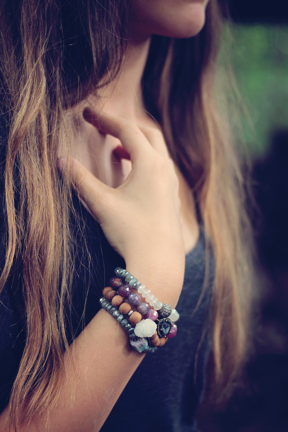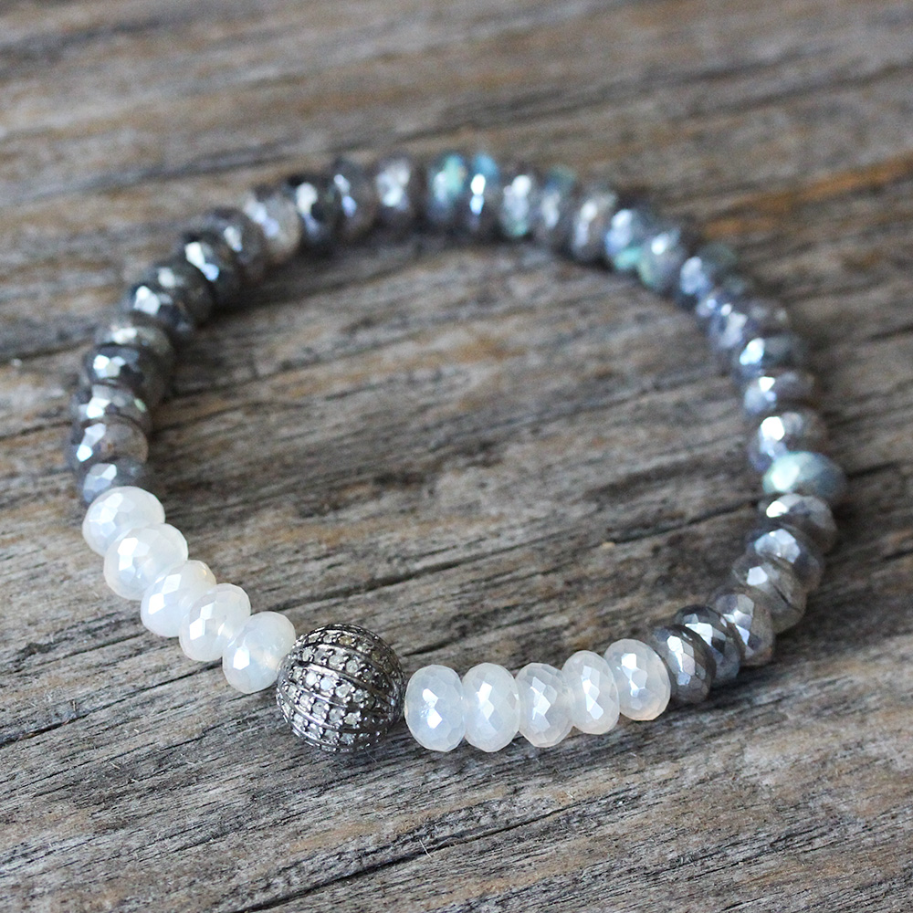 Simply outstanding aurora borealis finish moonstone and labradorite are paired with an exquisite genuine diamond pave focal in this breathtaking stacking bracelet. There are beautiful blues, greens, purples and even a hint of pink in the labradorite. The moonstone has a stunning pearl like look to it. Impeccable quality. The colors make it perfect for day to even and it plays well when stacked with others.