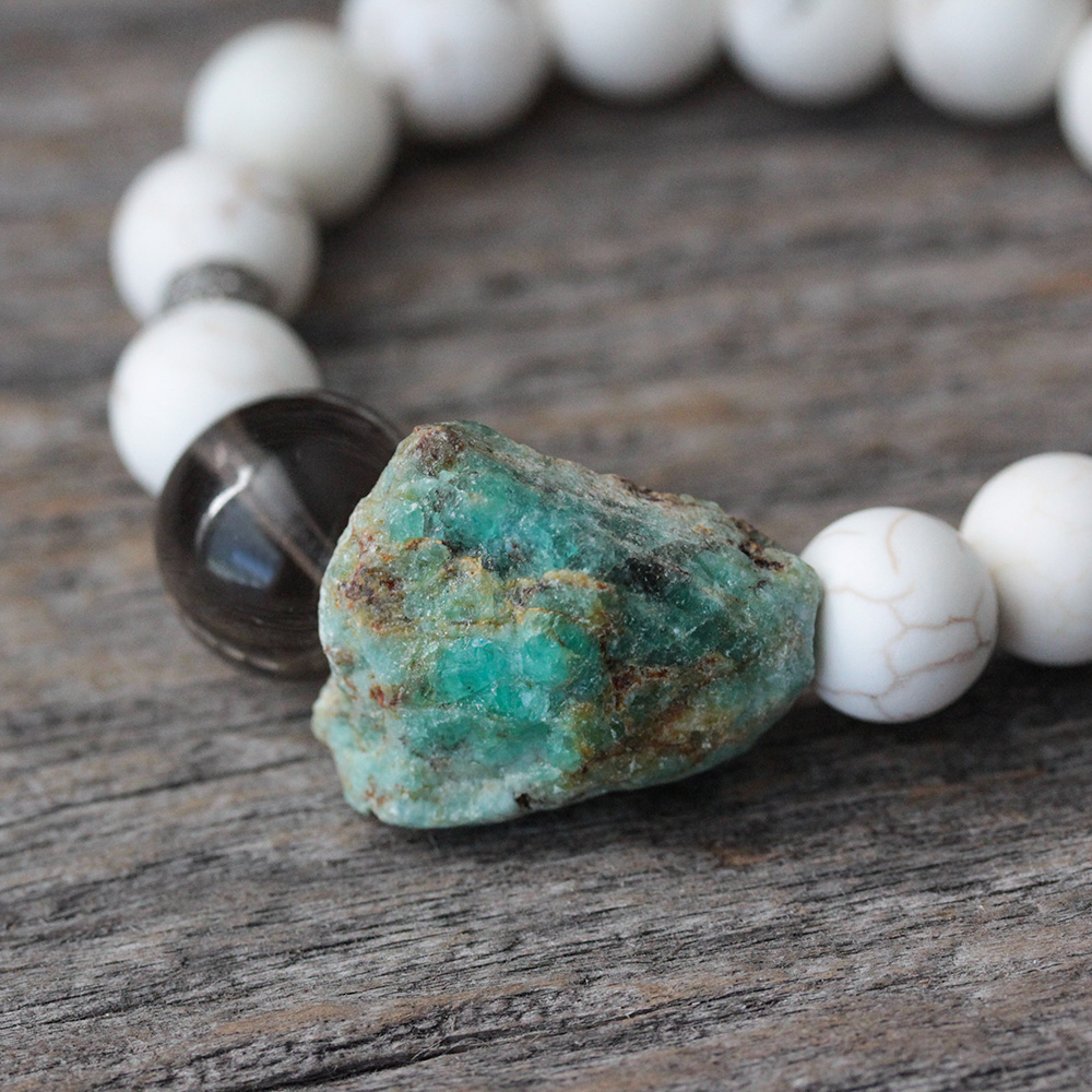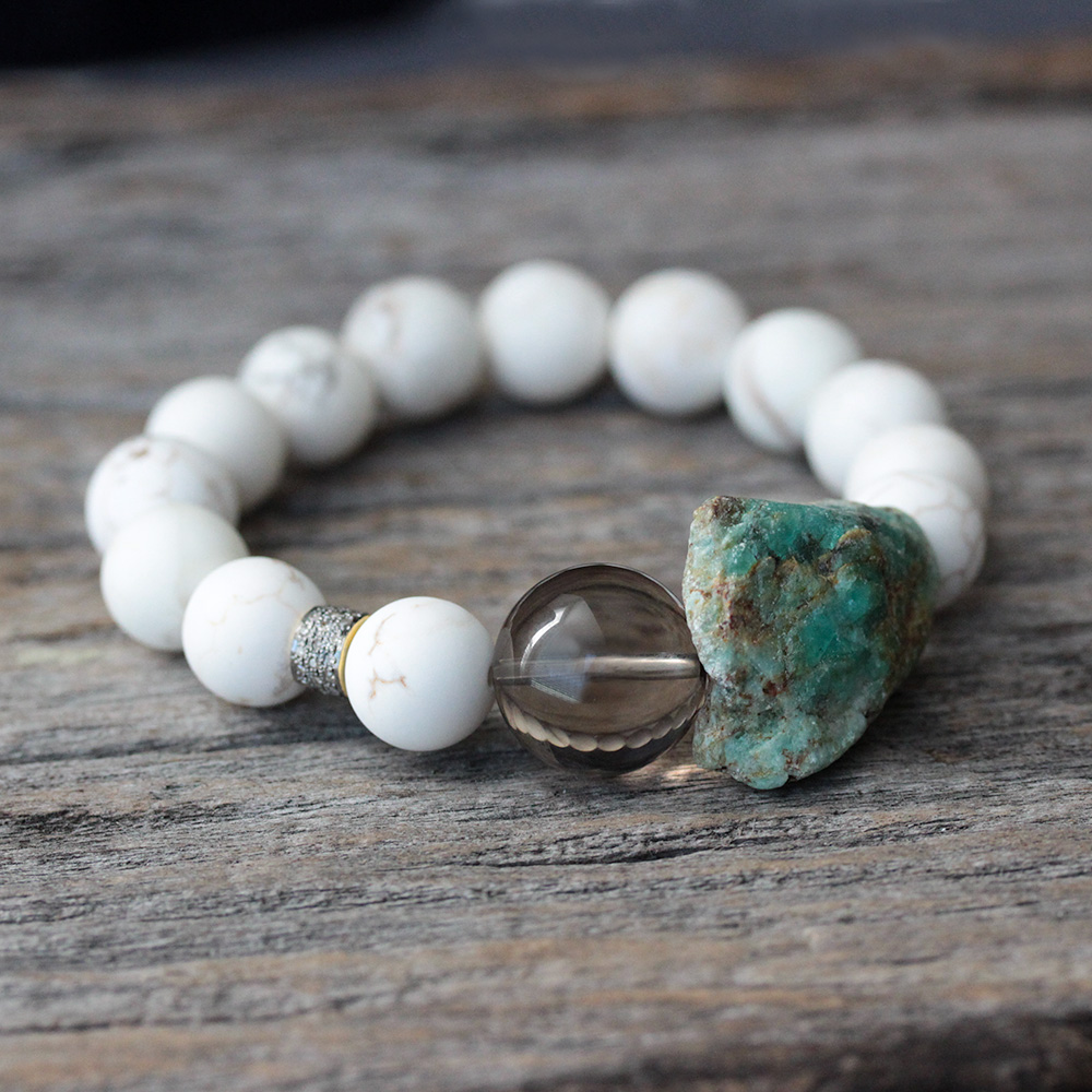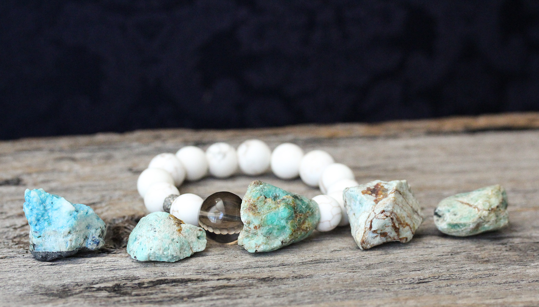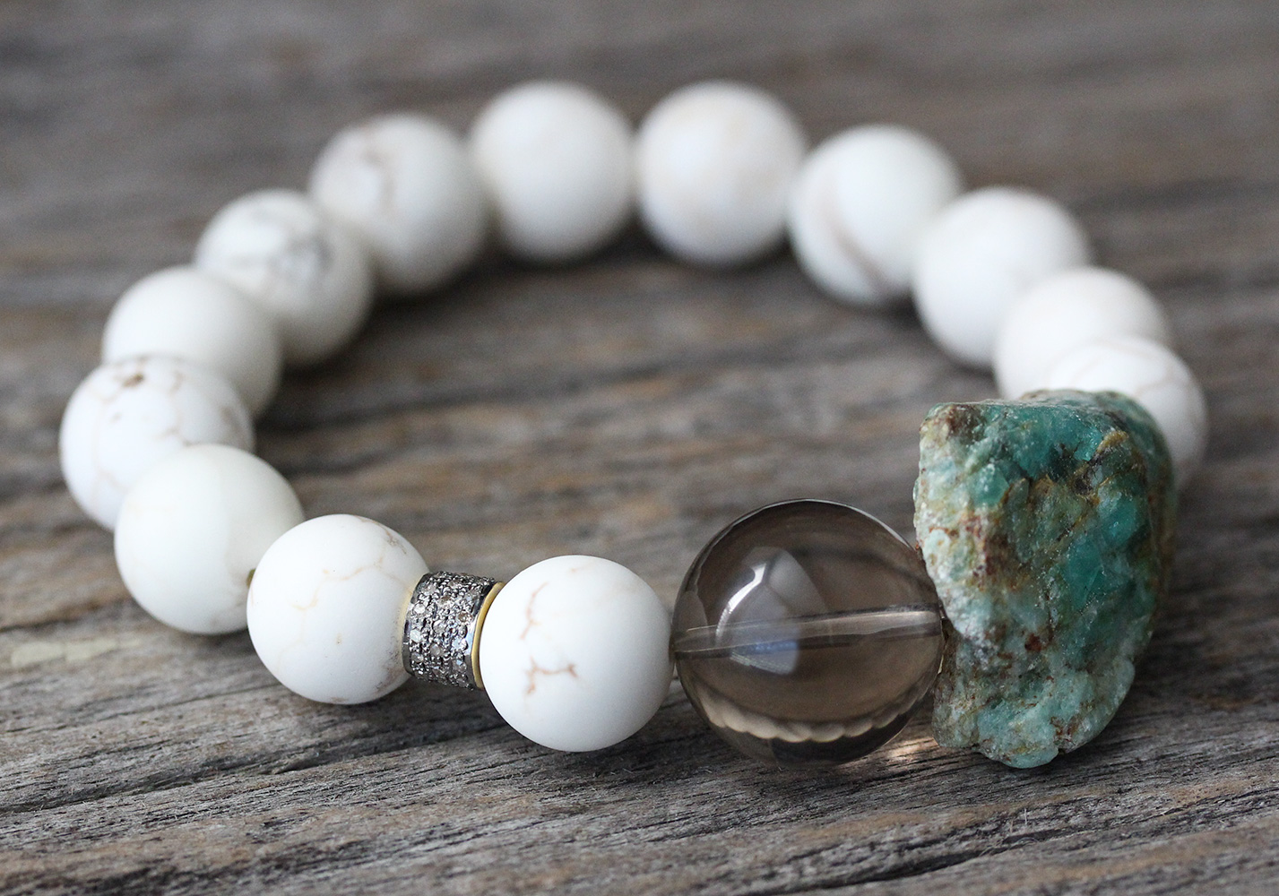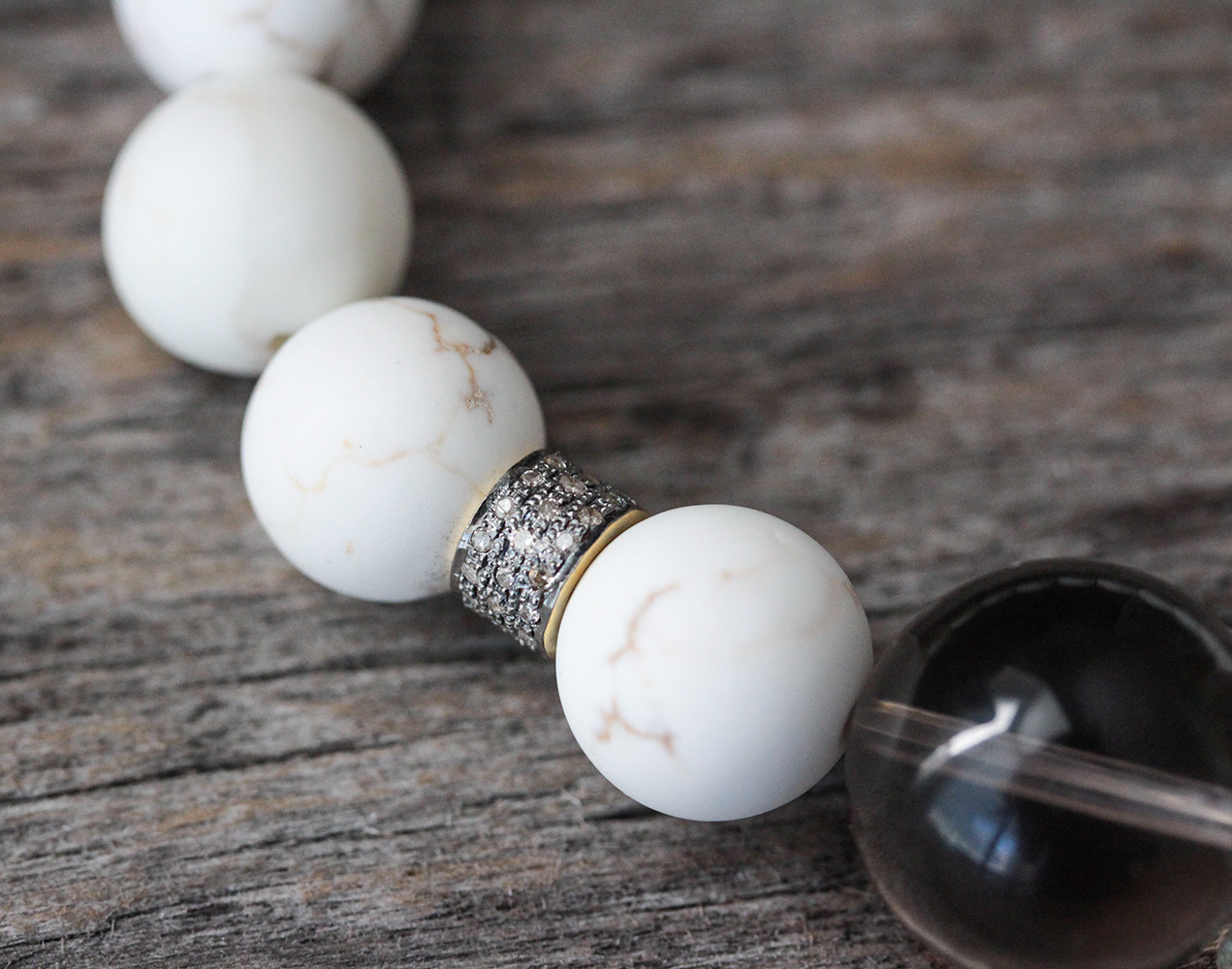 Raw kyanite in matrix it is paired with a flawless smooth round smoky quartz and a drop dead gorgeous champagne diamond pave focal in 14K gold over sterling silver. These are combined with beautiful generously sized white turquoise (magnesite). The result is pure magic.