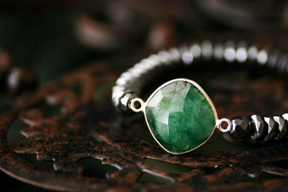 A stunning emerald is set in sterling silver and paired with beautiful faceted hematite in this gorgeous statement bracelet. The emerald is a generous 20mm. This bracelet looks amazing worn alone, but really stands out when stacked with others. It is sure to become a fast favorite.