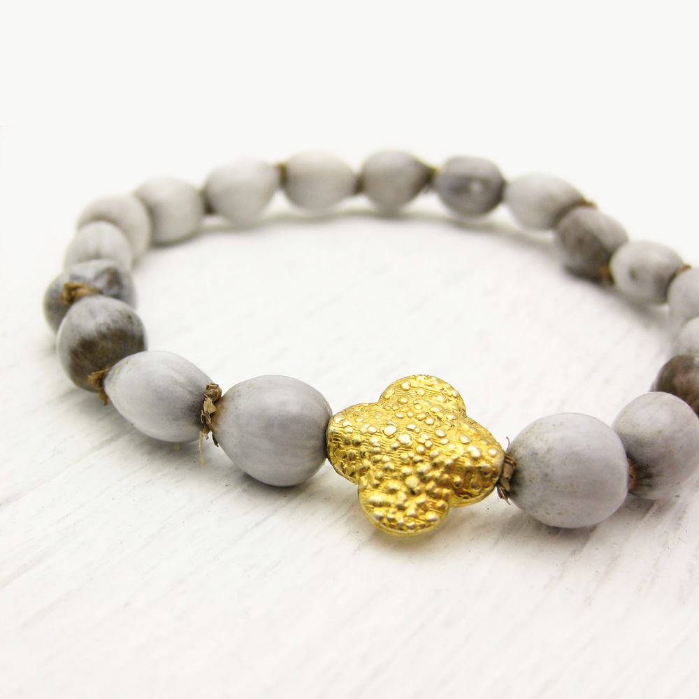 Once the seeds mature, they have a natural hole through the middle, but in order to create this bracelet, hand drilling was necessary. The Imfibinga seeds are complimented with a beautiful 18k gold vermeil clover focal bead.