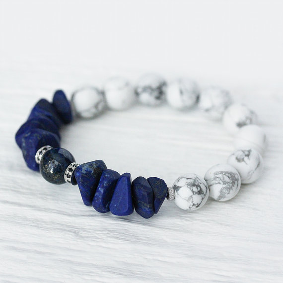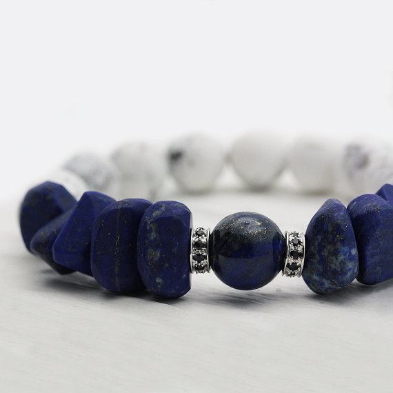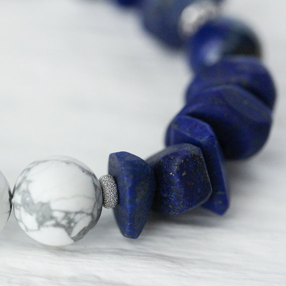 Words cannot fully express how beautiful these stones are in person. The color of the lapis is so bright and vivid and the quality of the stones is outstanding. They are 100% natural lapis from Afghanistan. I have paired them with two absolutely gorgeous pure 14K white gold with sapphires focals and two 14k white gold stardust beads that have a beautiful sparkle to them. These are solid gold, not plated. It also includes white and grey howlite that provides a perfect contrast to the bright blue. The center lapis stone and the white howlite are a generous 14mm. This is definitely a piece for those looking for that something special.