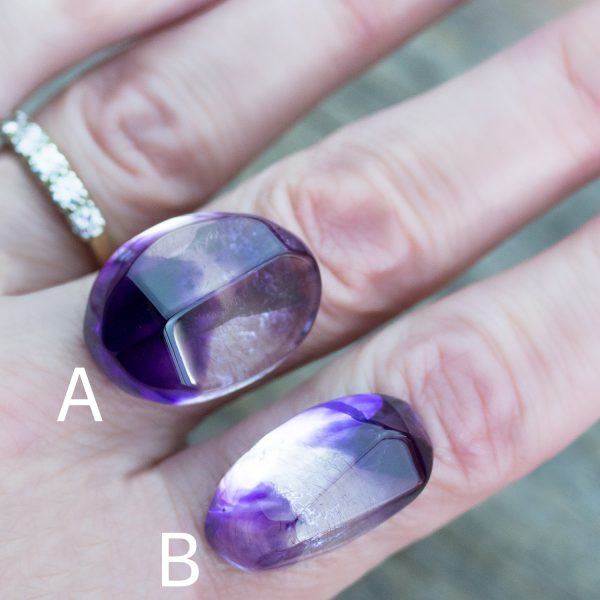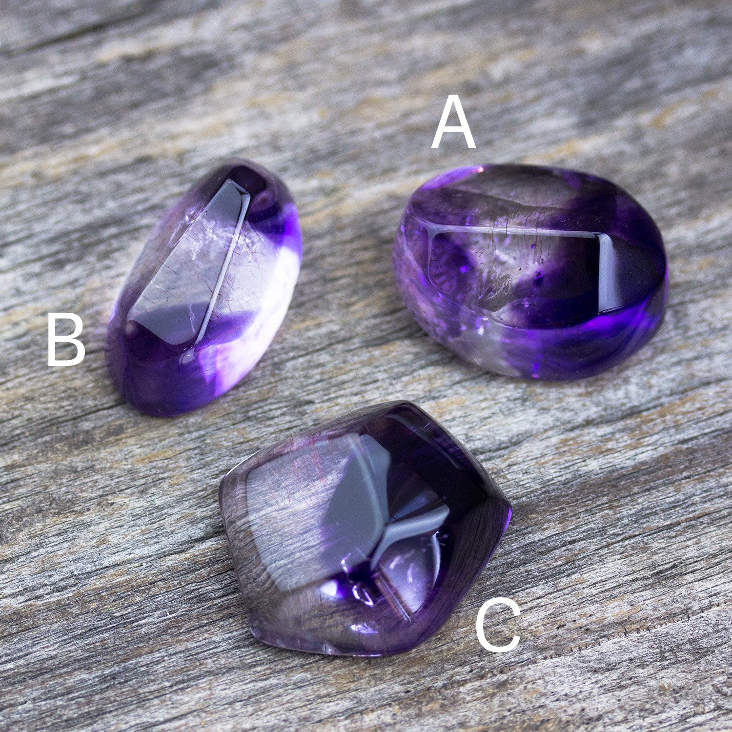 The stone in the ring pictured has been sold, but all available stones will have the same aesthetic and feel. Stone A will look almost identical in size and shape to the ring shown. Stone B is more narrow, but with a really beautiful cut. Stone C will be slightly different due to the coloring.