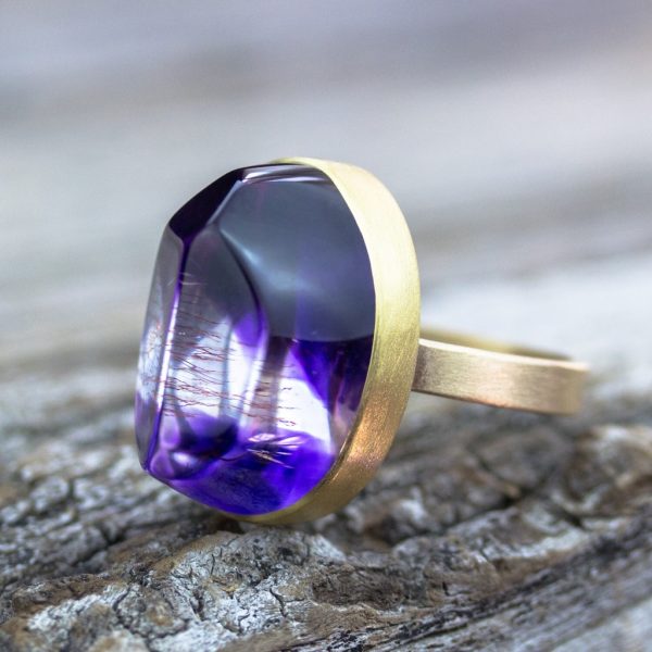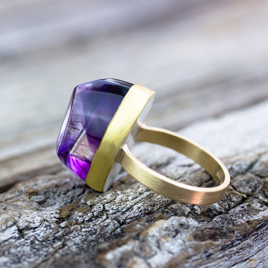 A truly breathtaking, hematite included, Moroccan amethyst stone is set in 18k gold and Argentium silver with a 22k gold bezel in this fun, mountain inspired, statement ring.