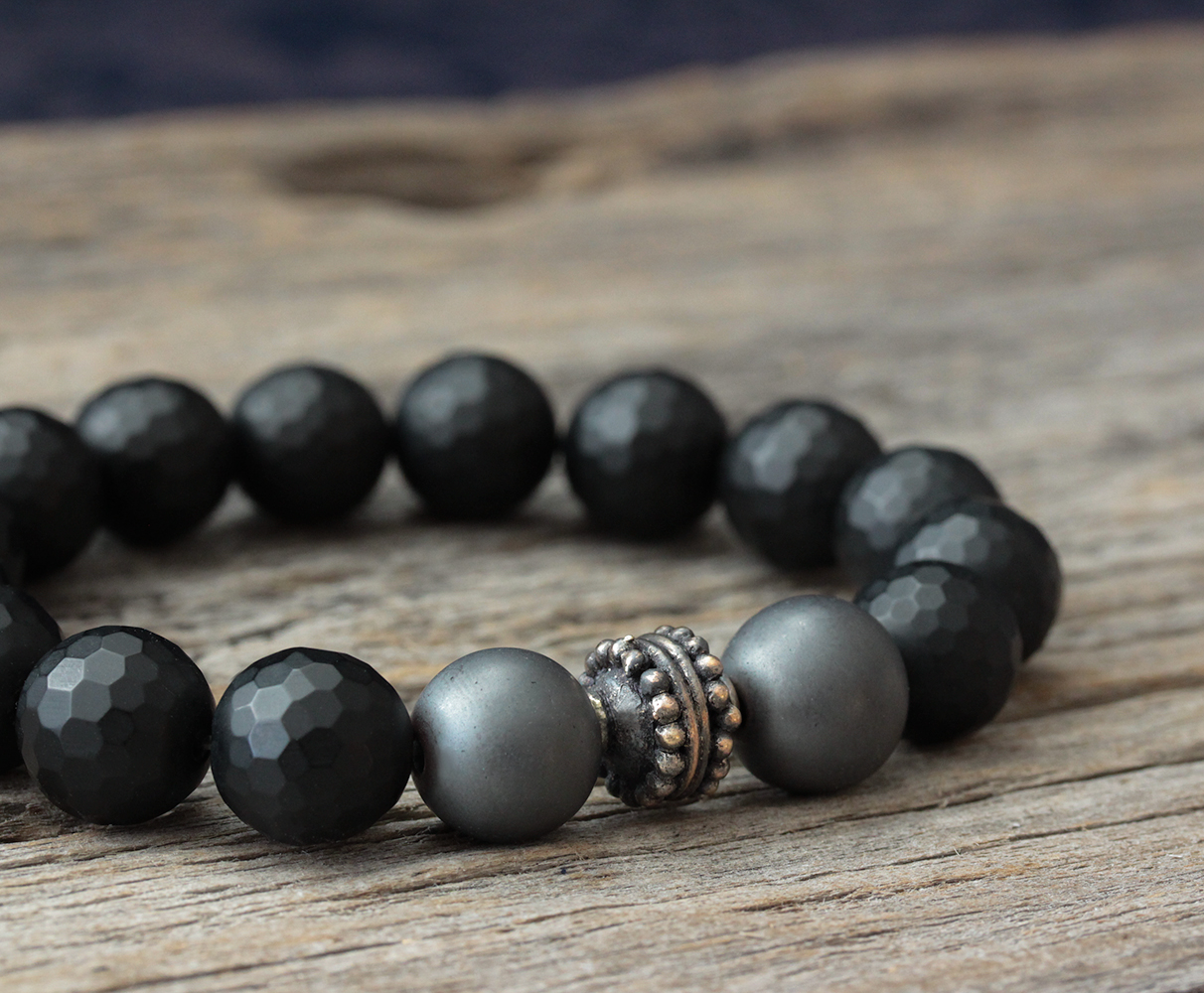 This is an incredible bracelet is made of micro faceted onyx and hematite. Both have a gorgeous matte luster finish to them. It is finished with a hand oxidized and polished Bali sterling silver focal (unless preferred without). The stones are a generous 12mm.