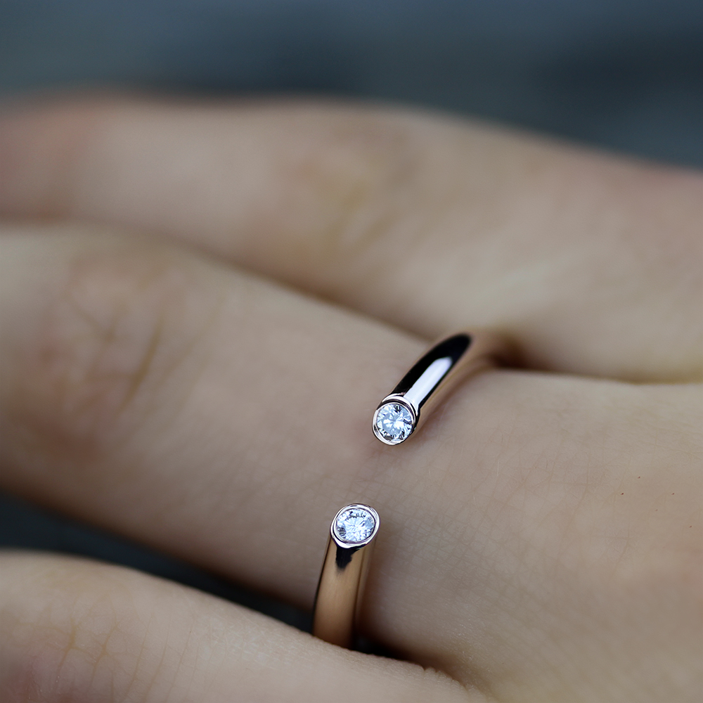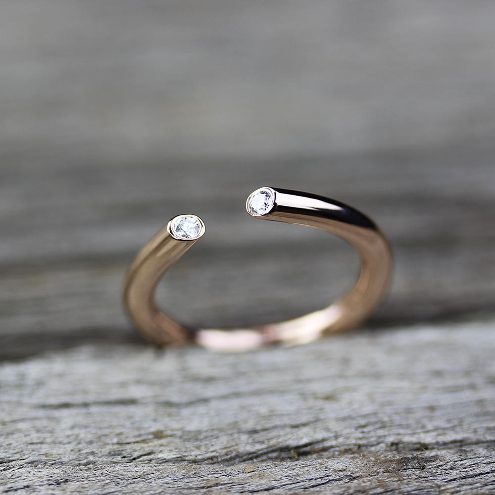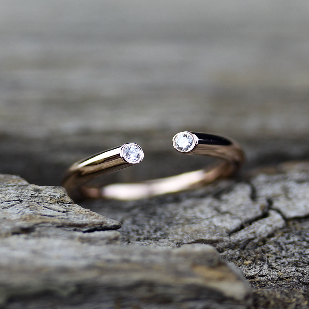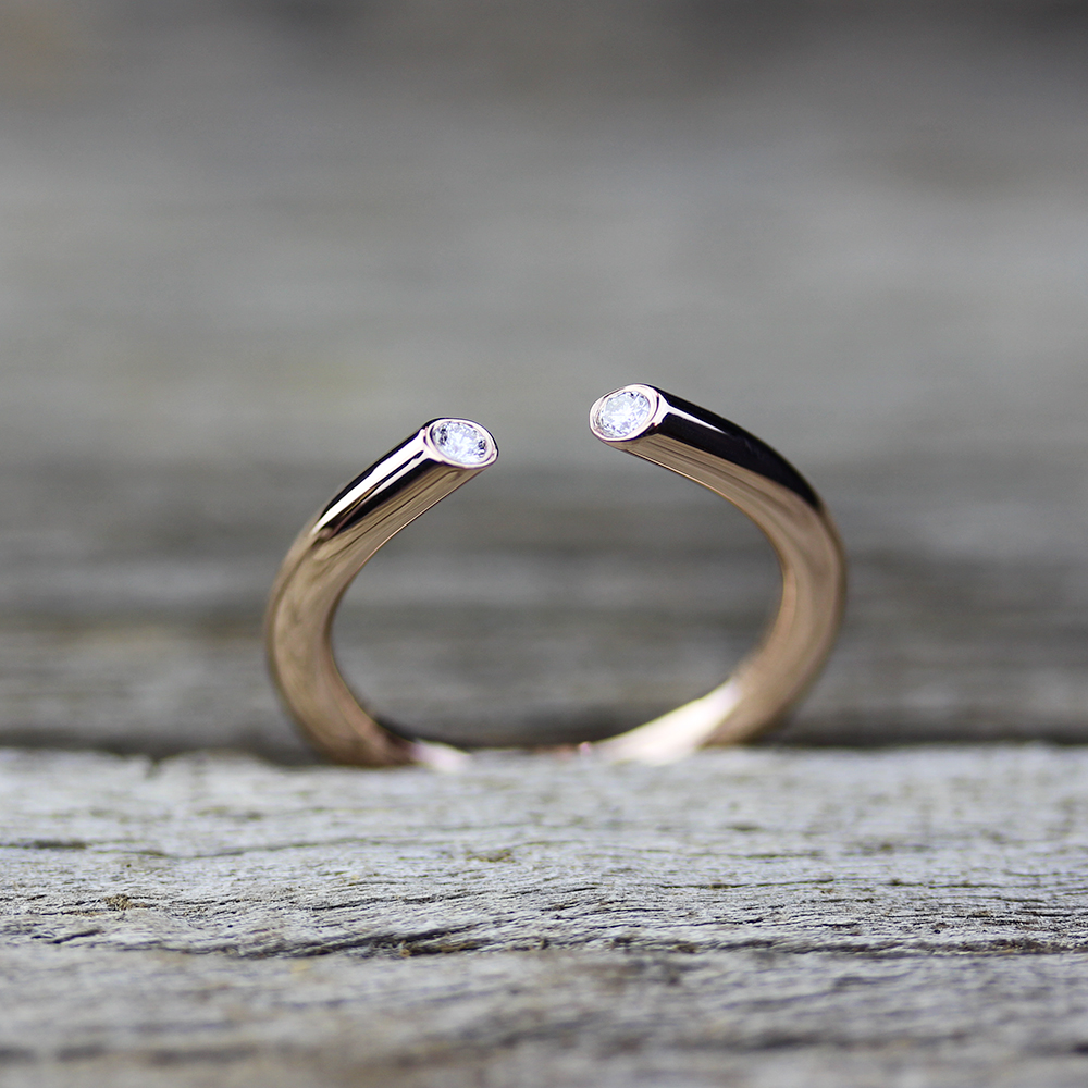 Two radiant VSI G-H white diamonds dance at the ends of gorgeous 14K Pink, White or Yellow Gold in this lovely open band ring. The diamonds are set at an angle to catch the light and your attention. This ring is absolutely lovely on its own, but also is wonderful for stacking with just about anything else. You will have a hard time leaving it at home.
