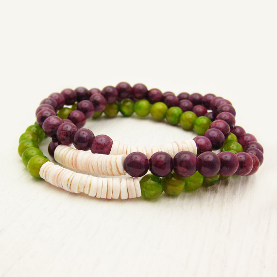 Gorgeous plum jade is complemented with beautiful delicate pinkish peach heishi shells in this sweet and colorful stacking bracelet. I love this stacked in multiples but it is also just precious when worn alone.