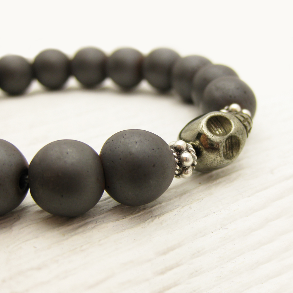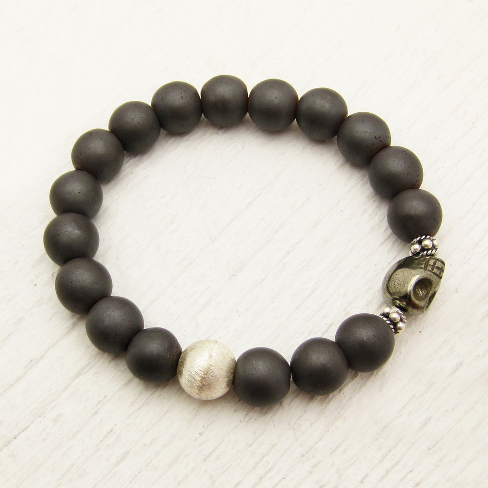 A beautiful Pyrite skull is surrounded in Bali sterling silver in this gorgeous matte hematite bracelet. The hematite is simply amazing. It is typically polished into a shiny silver color, but this is unpolished and matte. It is rustic and a bit modern and is finished with a beautiful brushed sterling silver focal bead.