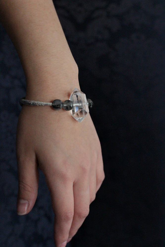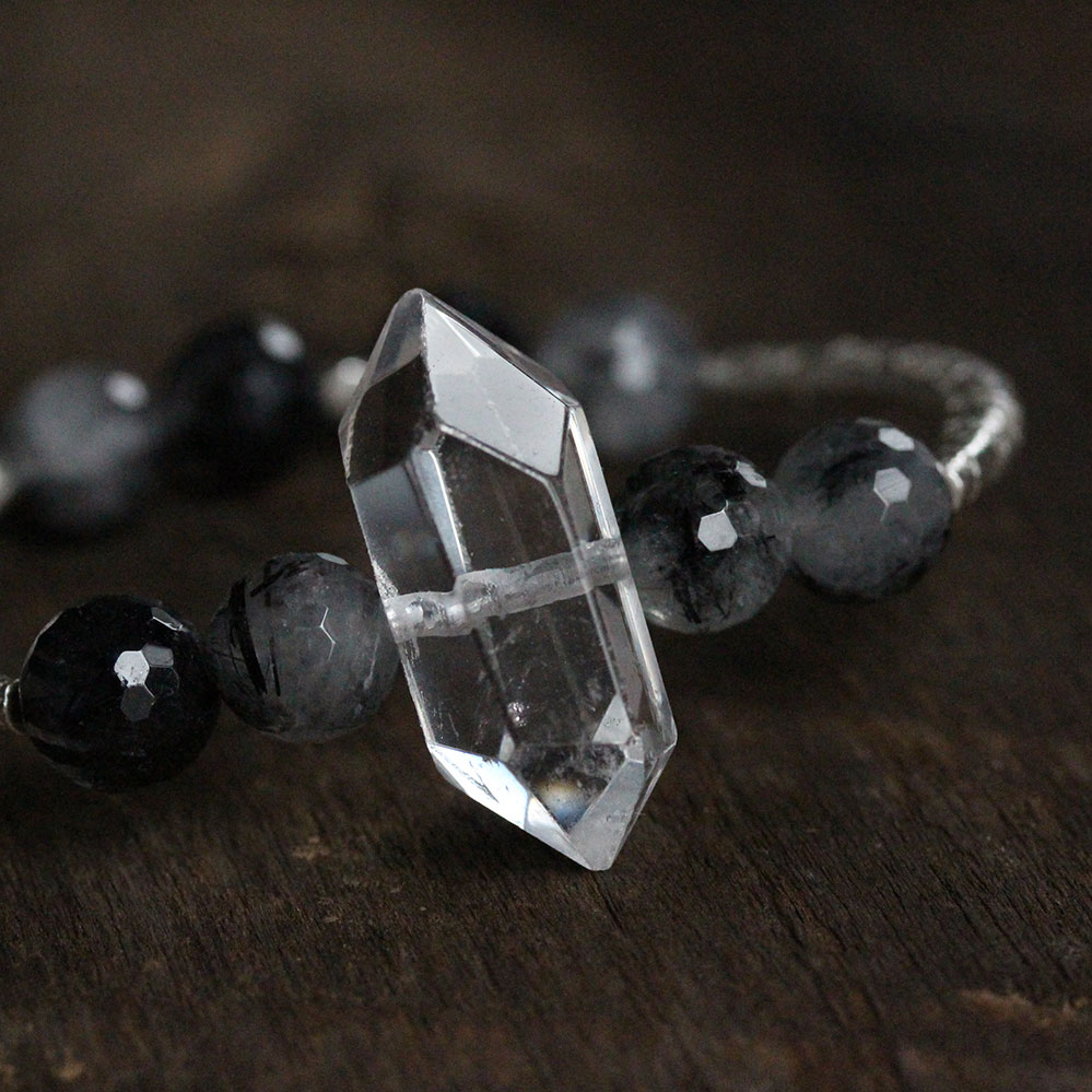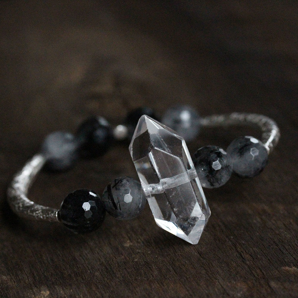 A gorgeous, huge, natural double terminated quartz crystal focal stone makes quite a statement in this beautiful bangle bracelet. It is complimented with lovely faceted tourmalated quartz and simply divine hand hammered Karen Hill Tribe Silver. This silver has a higher content of silver than its sterling counterpart. It is handmade by the Karen tribe in Thailand and has a distinct “seam” that verifies its authenticity. It is truly gorgeous craftsmanship that is done entirely by hand without the use of machines.