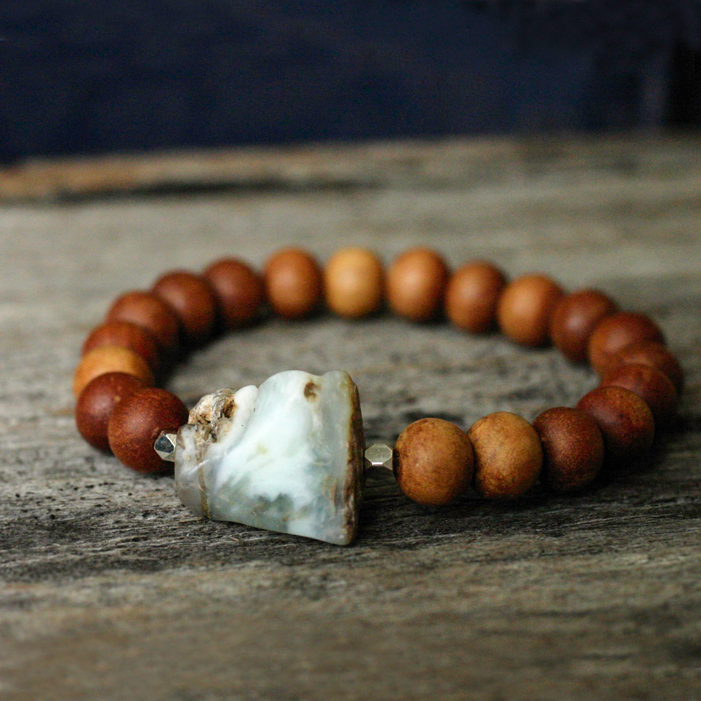 Peace inducing fragrant sandalwood is complimented with a simply gorgeous raw Peruvian Opal and sterling silver nuggets in this beautiful bohemian bracelet. The fragrance is very subtle, slightly sweet and musky. It isn’t strong enough for others to smell on you, but when you inhale it will take you to a distant, exotic place in your mind. So amazing.