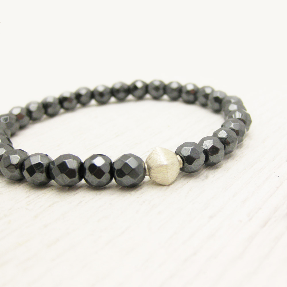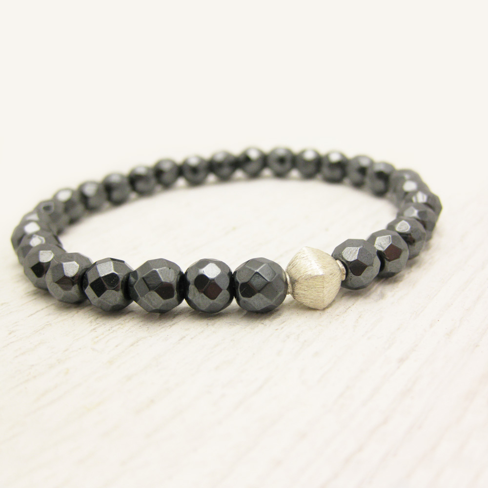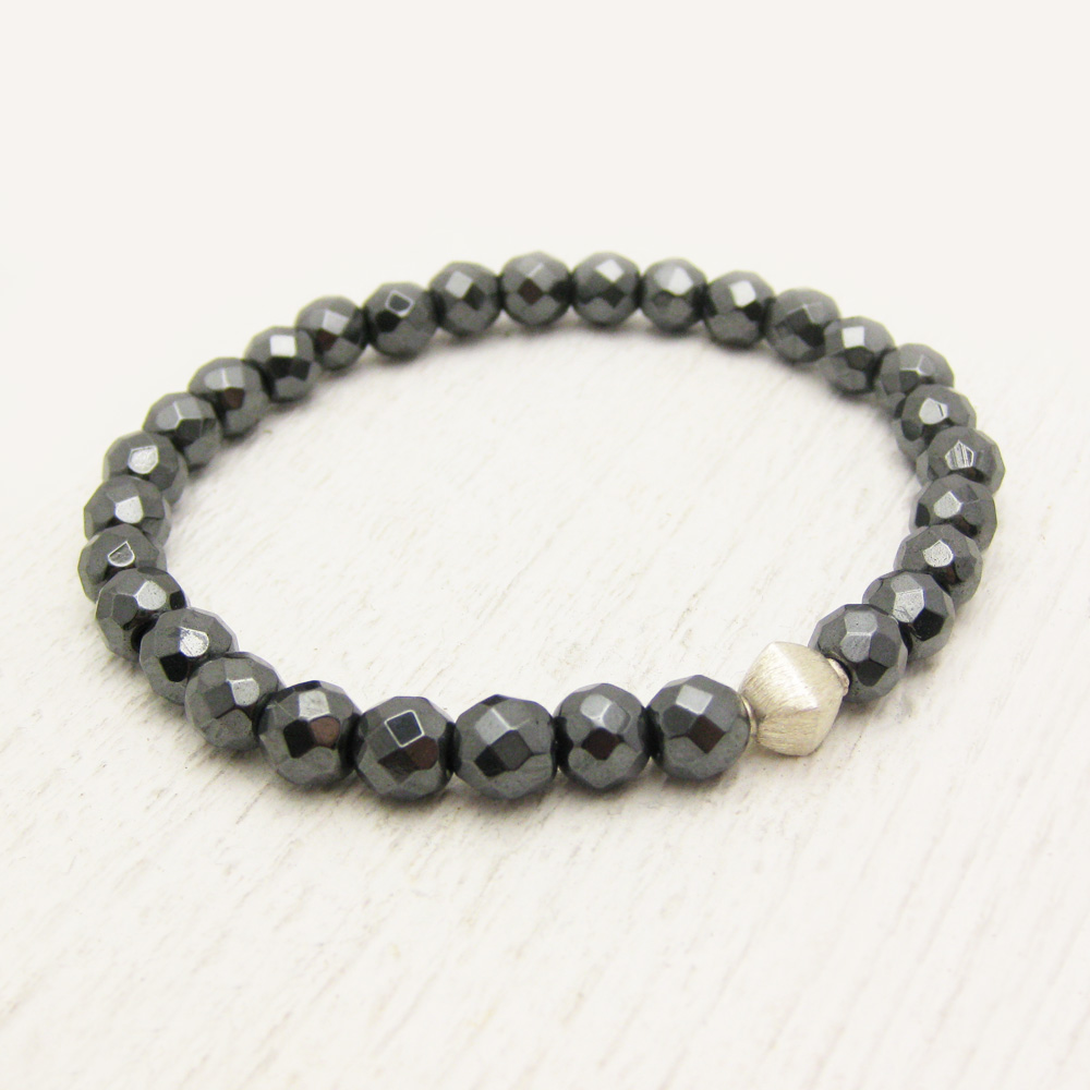 The stones are 8 mm faceted hematite. It has been accented with a beautiful brushed Hill Tribe Brushed Sterling Silver Diamond shaped bead. This bracelet works all year round and will become a staple.