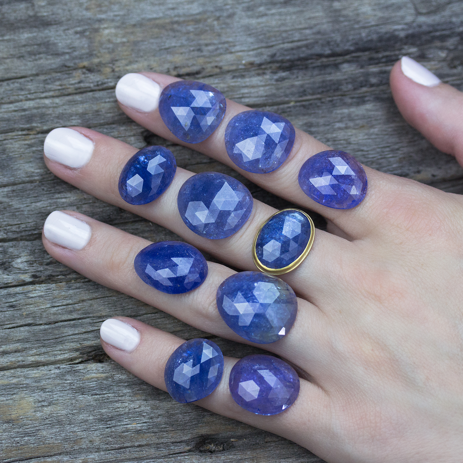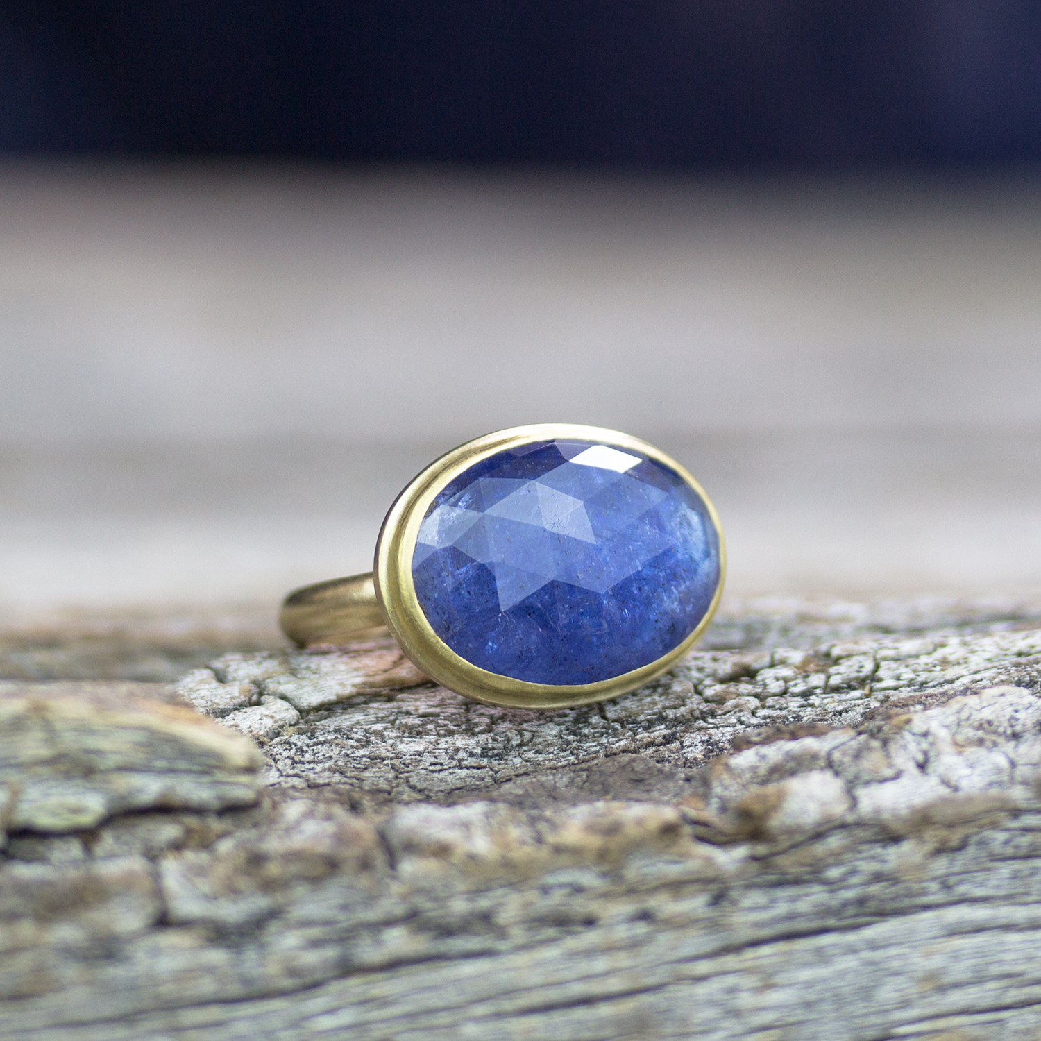 Gorgeous tanzanite glows and shimmers in this solid 18k gold with 22k bezel ring. It has a dusted matte finish and is sized to order. This ring is made entirely by hand fabrication.