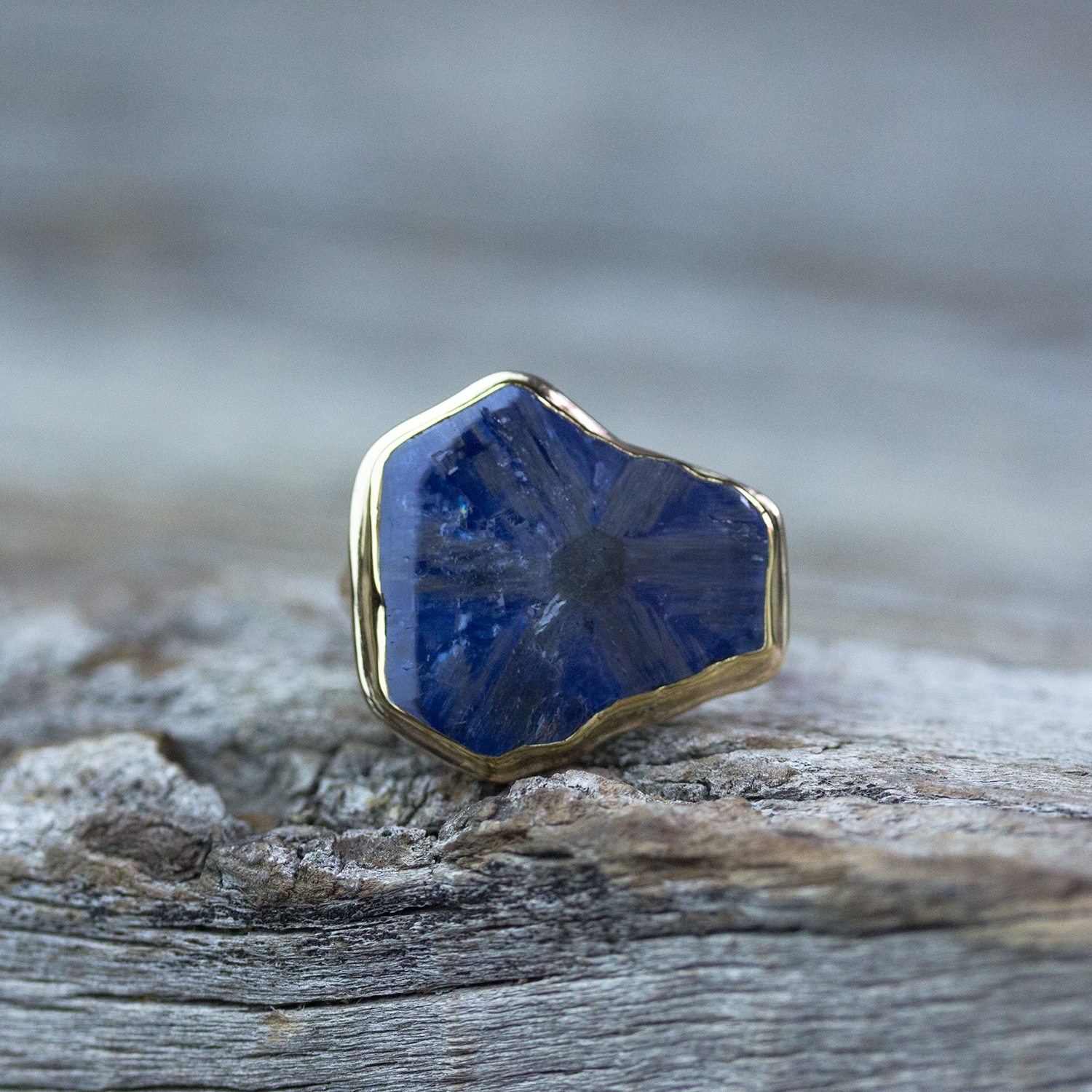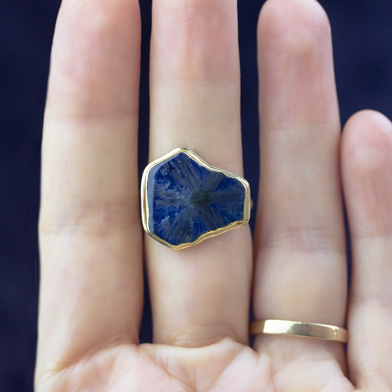 This gorgeous 100% natural Trapiche sapphire ring is fabricated entirely by hand using 18k & 22k gold. The sapphire transforms from a gorgeous deep blue to showing off its 6 point star. With just a slight turn of the finger, it comes to life.