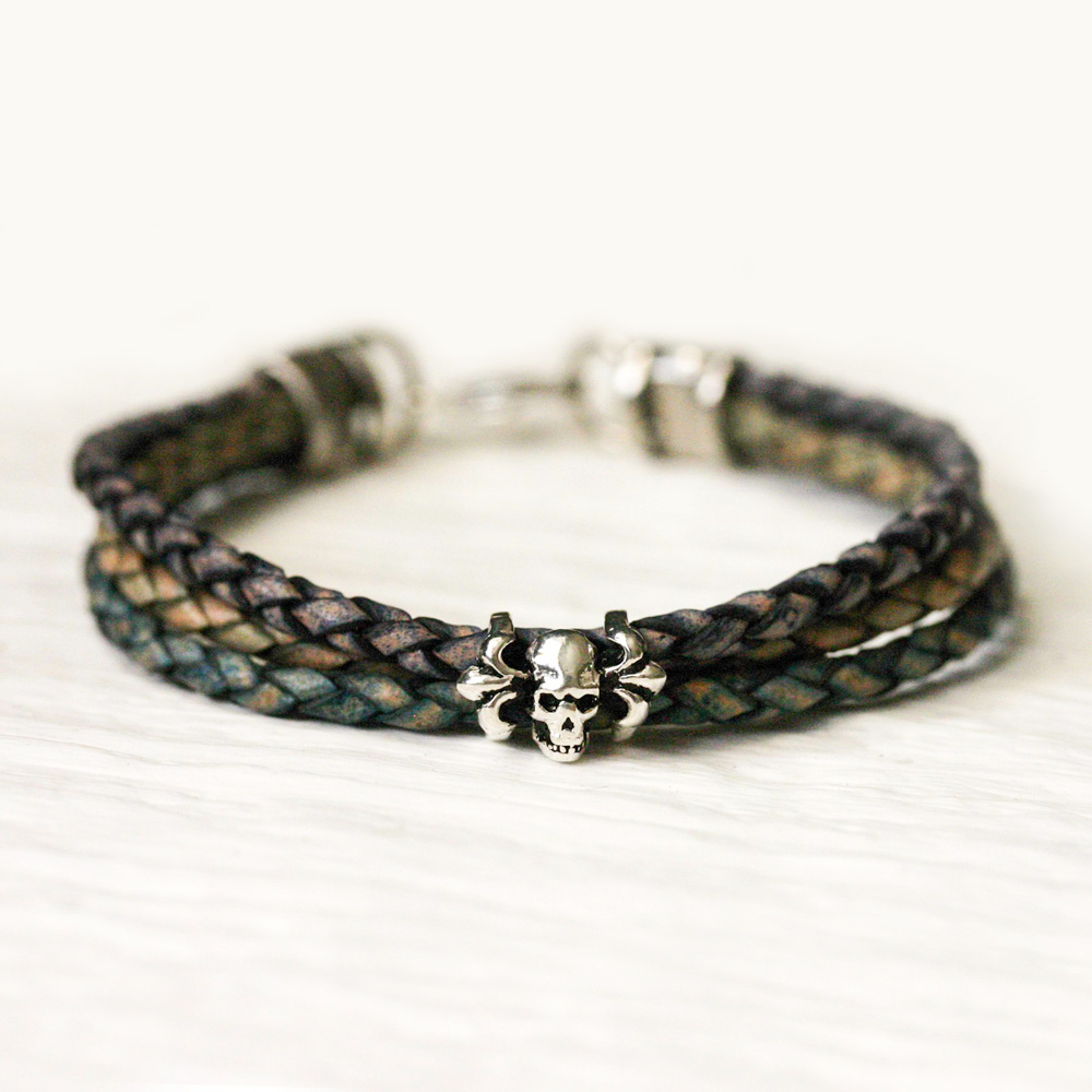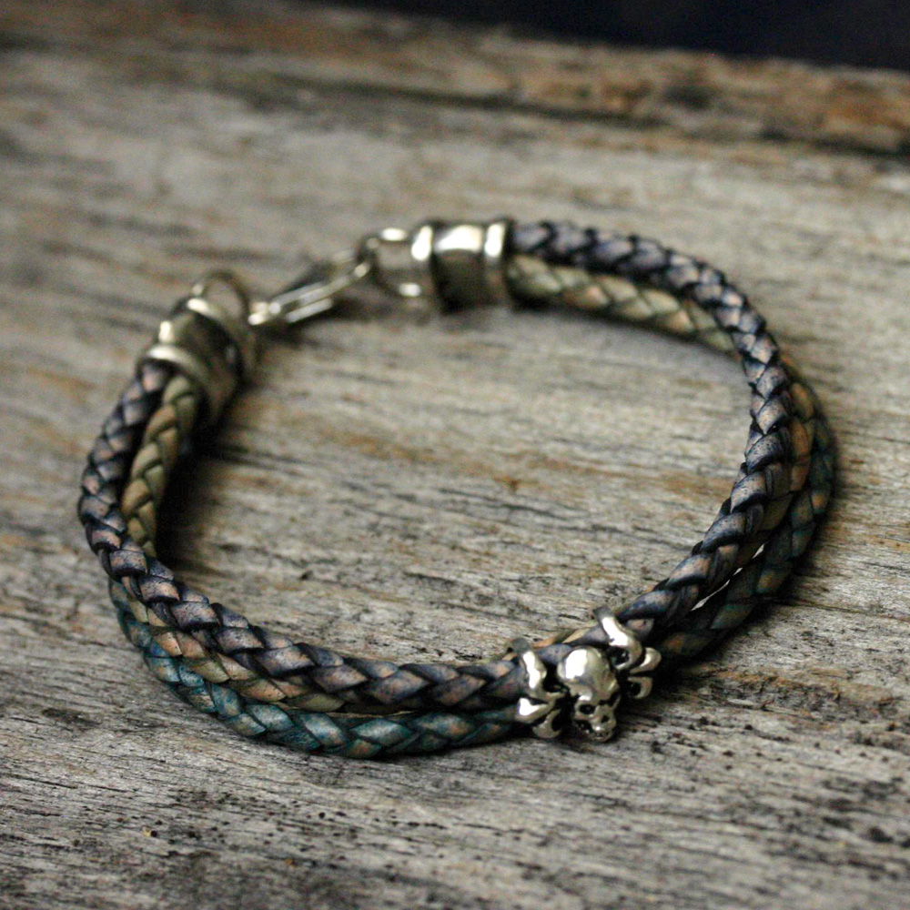 Three gorgeous eco-friendly braided bolo leather cords are accented with a sterling silver skull. The leather is incredibly soft and supple and each has beautiful natural color variations in blue, purple and olive green. It is finished in solid sterling silver with a sterling silver lobster clasp.