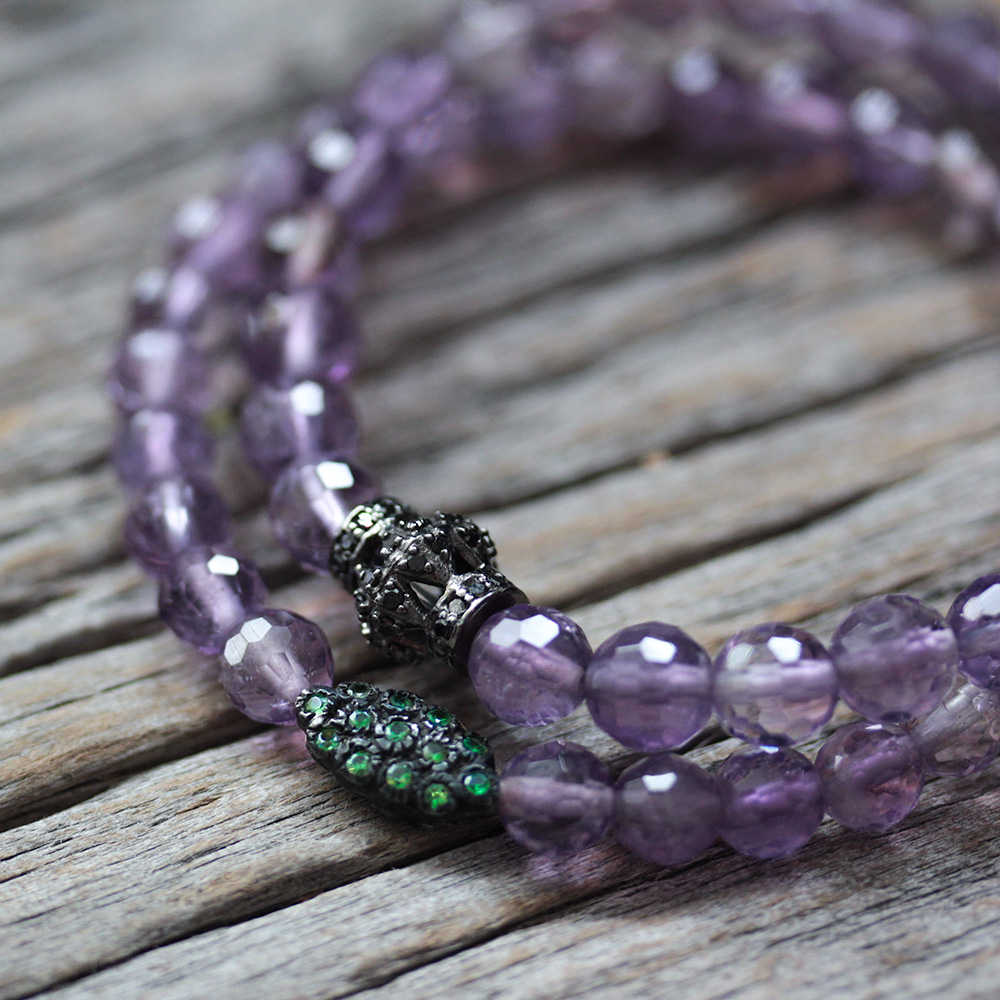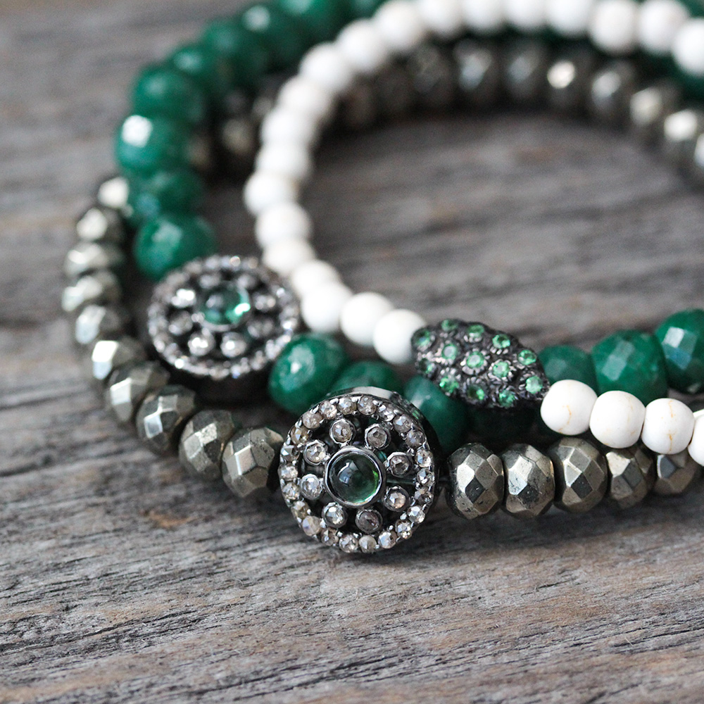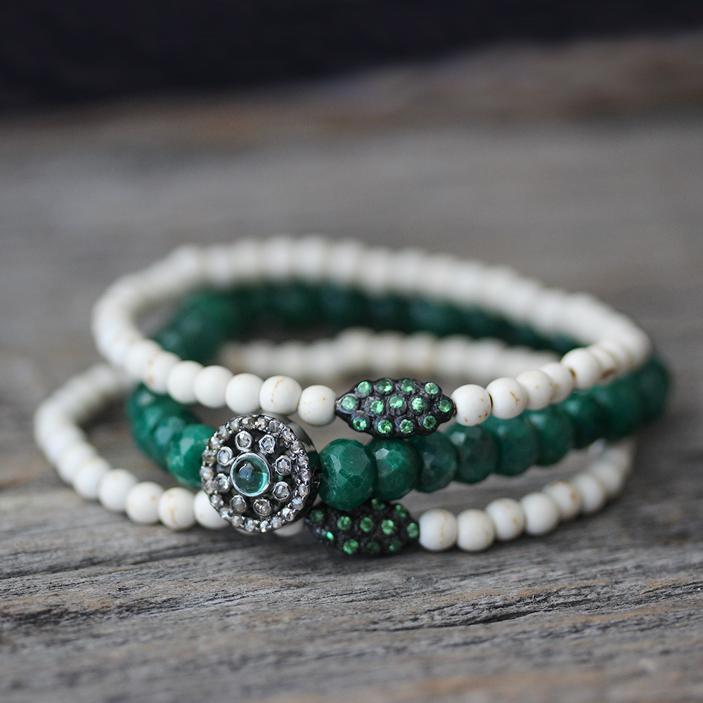Beautiful bright green tsavorite in blackened sterling silver is paired with the sweetest 4mm white turquoise (magnesite) stones in these cute stacking bracelets. The tsavorite looks like candy and adds a gorgeous pop of color to your stack.