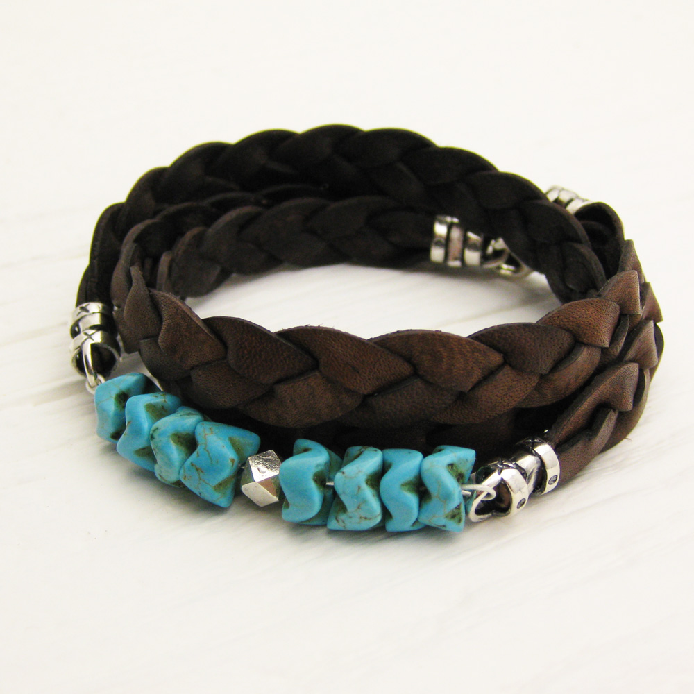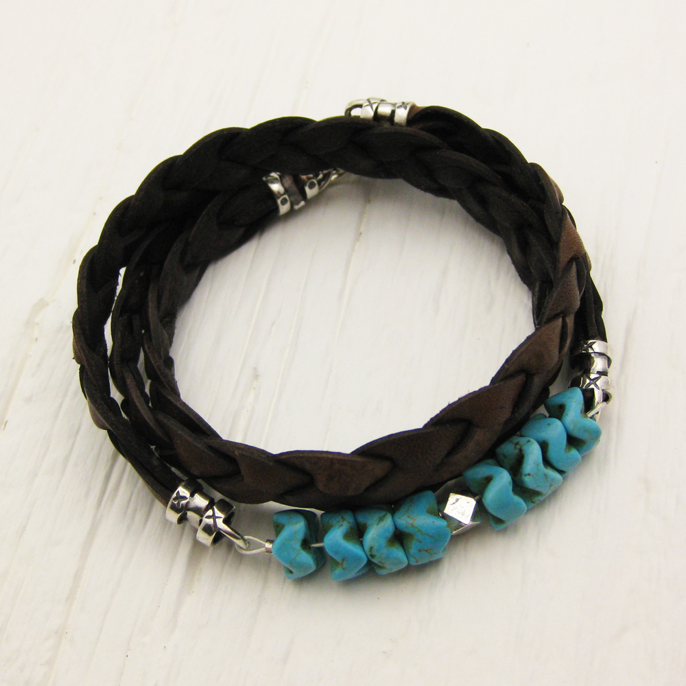 Gorgeous, supple eco friendly braided leather is complimented with natural turquoise zig-zag beads in this fun, bohemian, wrap bracelet. The turquoise is incredibly rare. In order to cut in this type of shape, there needs to be a very large vein of turquoise in the stone. It is then stabilized and formed into beads. They are really wonderful stones. The leather is simply the best you can get. It is eco-friendly and sooooo soft. I have used all sterling silver hardware throughout. It wraps around the wrist 3x.
