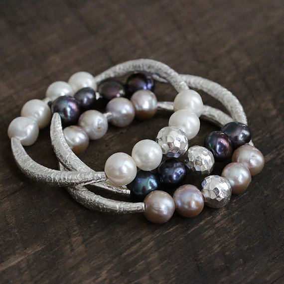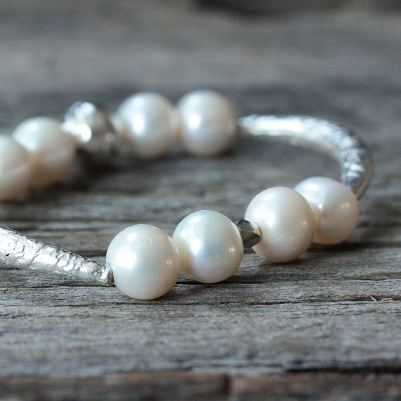 Gorgeous 100% natural white fresh water pearls are complimented with luxurious hammered Karen Hill Tribe silver. These pearls have a beautiful luster. The hill tribe silver has a higher content of of silver than its sterling counterpart. It is handmade by the Karen tribe in Thailand and has a distinct “seam” that verifies its authenticity. It is truly gorgeous craftsmanship that is done entirely by hand without the use of machines. This is a really versatile bracelet that can be dressed up or down.